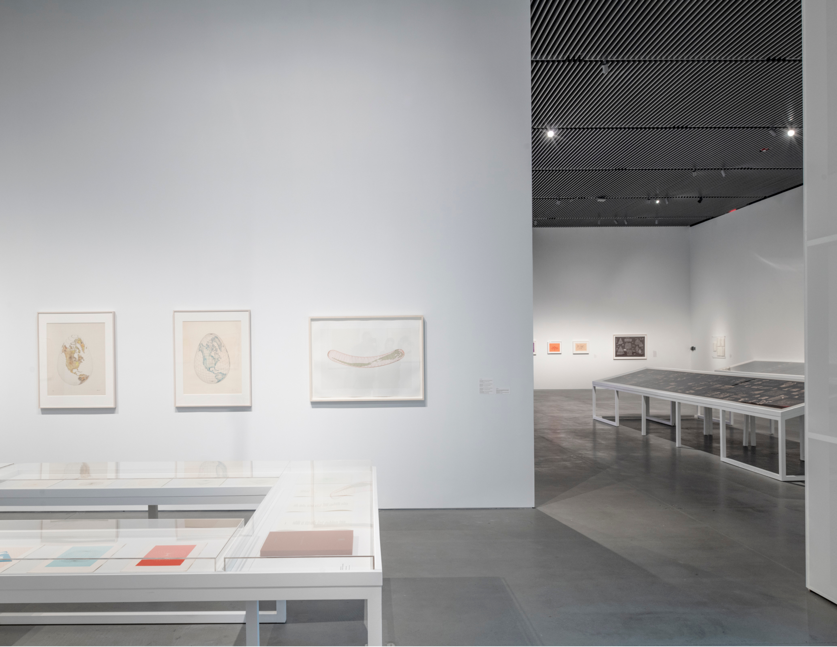 Display elements are manipulated into unexpected configurations. Walls vary from solid to light, vitrines are built into floating partitions, and plinths are stretched into uncomfortable proportions—all connected to the artist’s inimitable perspective. The lower level focuses on a small selection of works, confronting one another through a set of full-height partitions whose presence varies as one moves between works mounted across the vast gallery space.