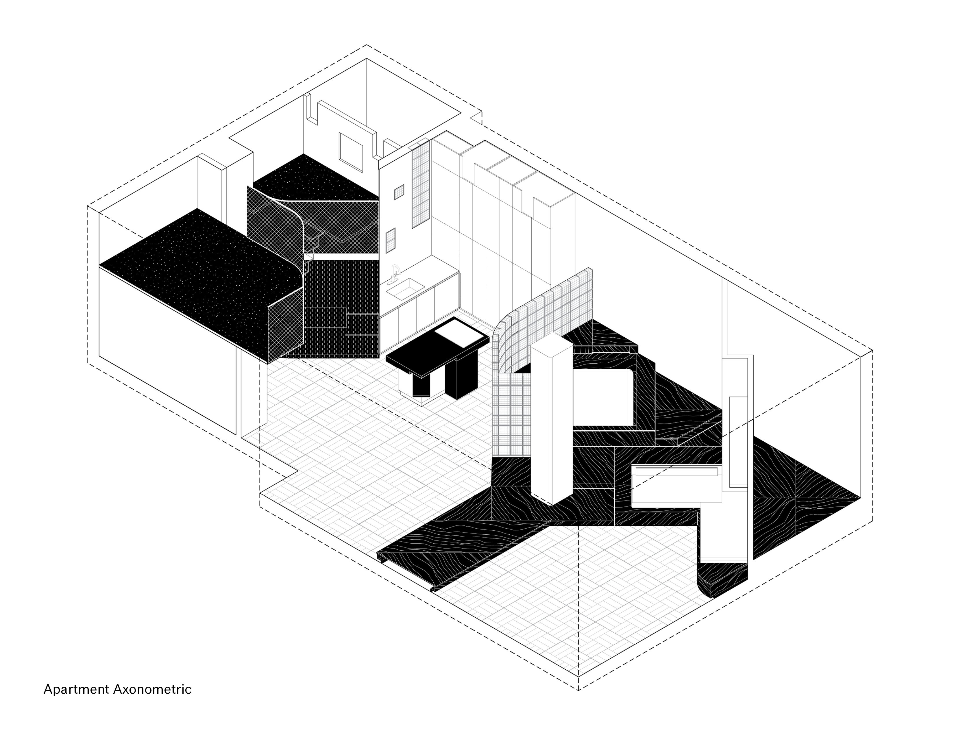 In this apartment renovation, the logic of a singular existing platform was multiplied to create a landscape of cascading, “off-axis” platforms, demarcating zones for entertaining, sleeping, and storage.