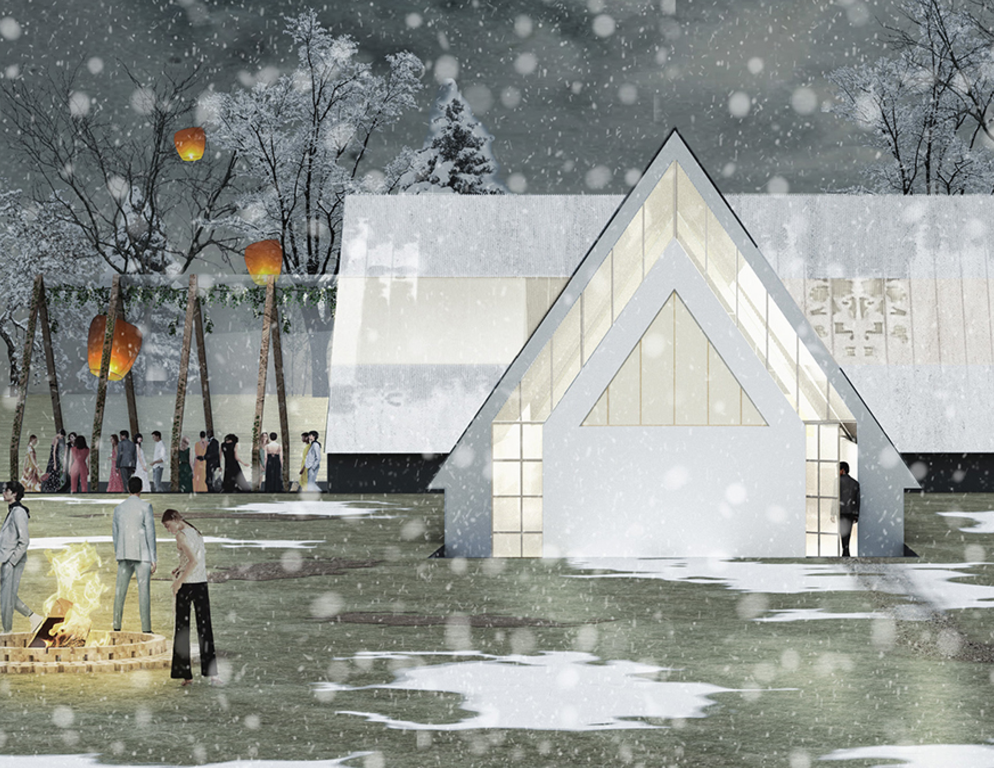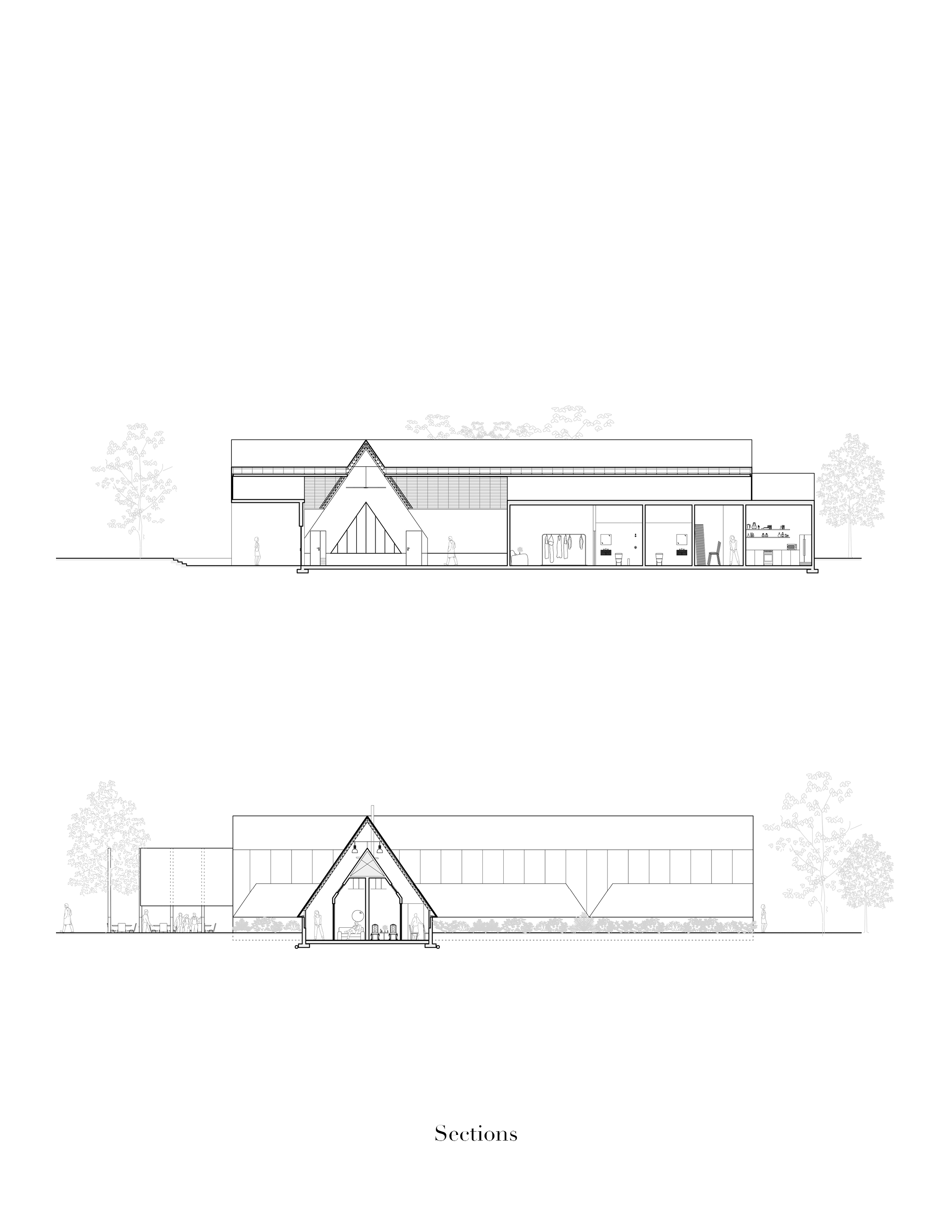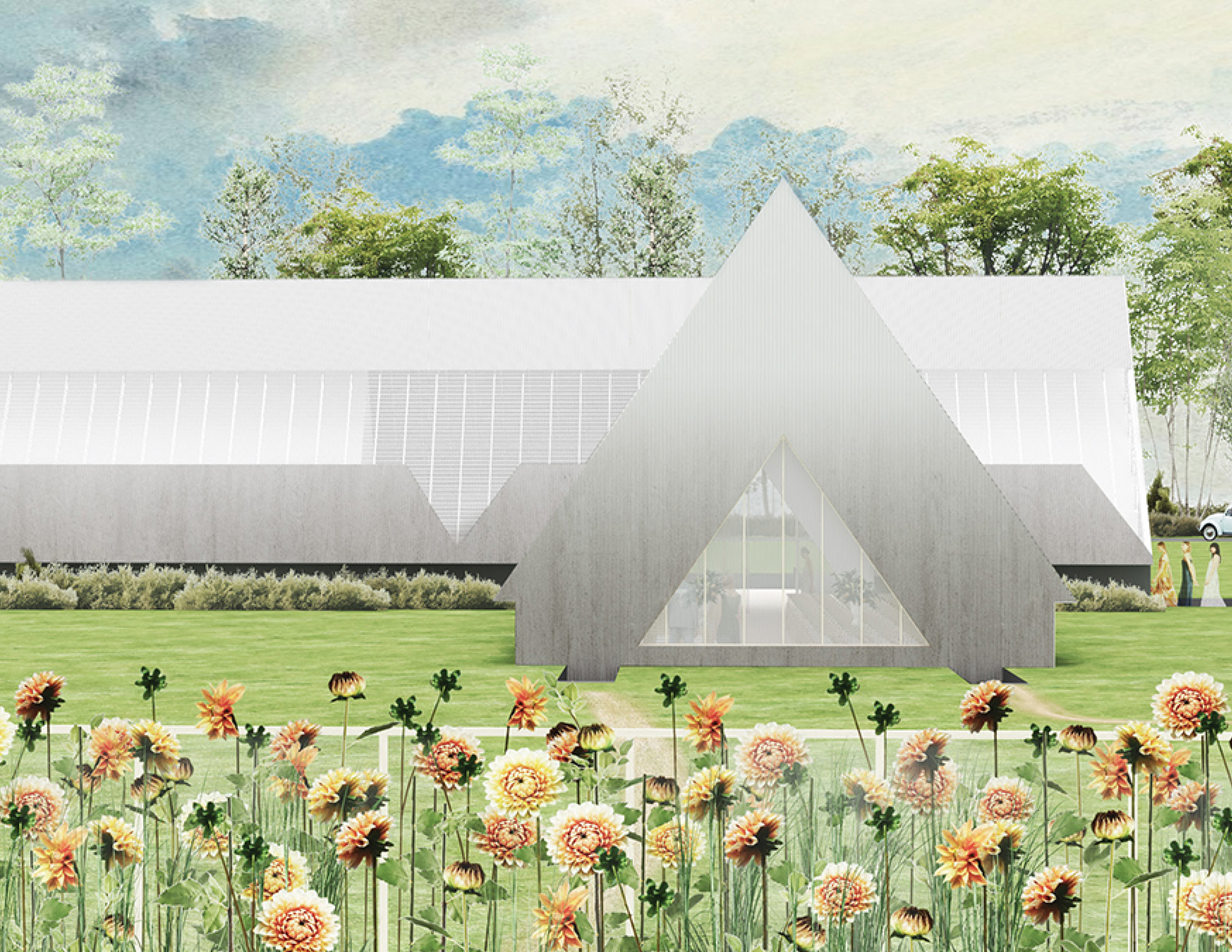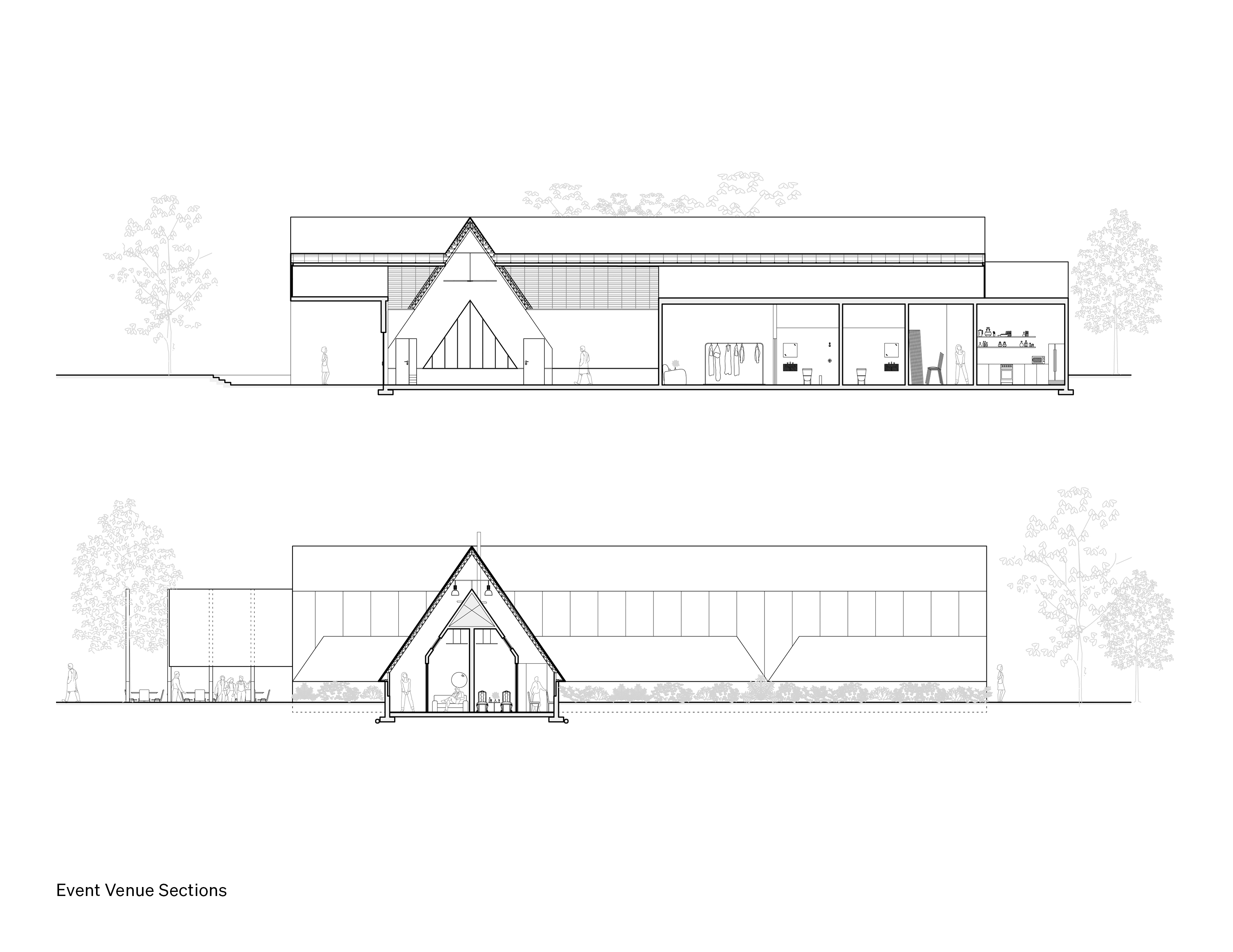 For the event venue, we began by learning about regional construction from local builders, moving toward a model of pre-engineered industrial architecture instead of hospitality design. These inherited systems tie into local exchange networks expertise, finding a new value in an overlooked type. The project acts as a node to orient the current farm: using views and paths to connect field to greenhouse and planting beds to picturesque pathways. The venue itself comprises two intersecting programmatic bars. In one axis, the main entry gives way to back of house services, changing rooms, and other functions housed in a smaller nested structure. The perpendicular axis acts as a large, open hall to accommodated events of different sizes and types.