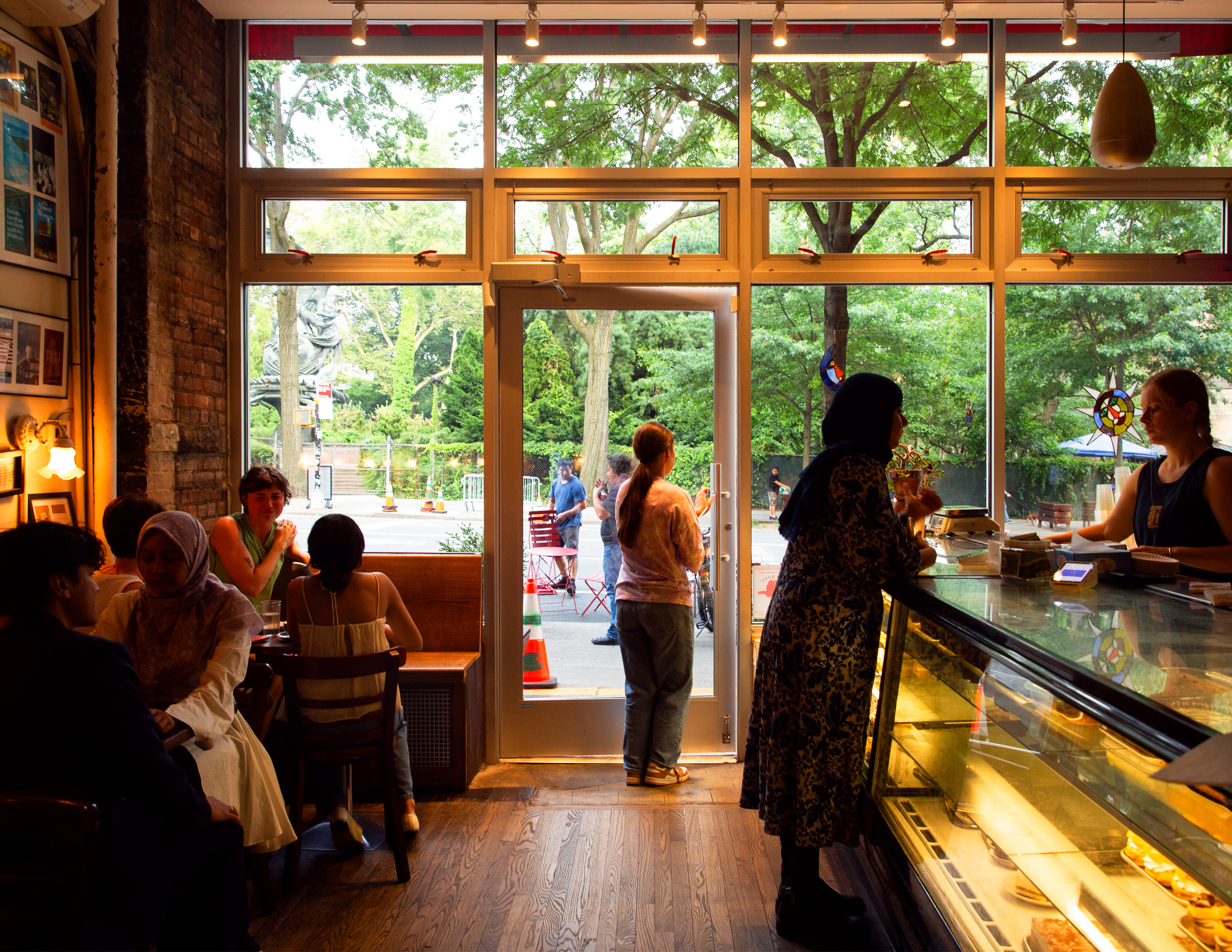 We were asked to replace the storefront of an Upper West Side cultural landmark, an institution for both the neighborhood and students at adjacent Columbia University. In addition to updating the design, we considered how to preserve the existing paintings by the painter Yanni Posnakoff that were originally installed in the 1970s. These paintings characterized both the facade and the spirit of the cafe, but were damaged and faded from time. For the project, translated them into mosaic tiled panels that would become the facade itself, a muraled surface that would do double-duty as both wall and image. We wanted to avoid reproducing the paintings, and instead abstracted key and recognizable components that we floated over color fields—an echo of the original, frozen into an architectural detail.