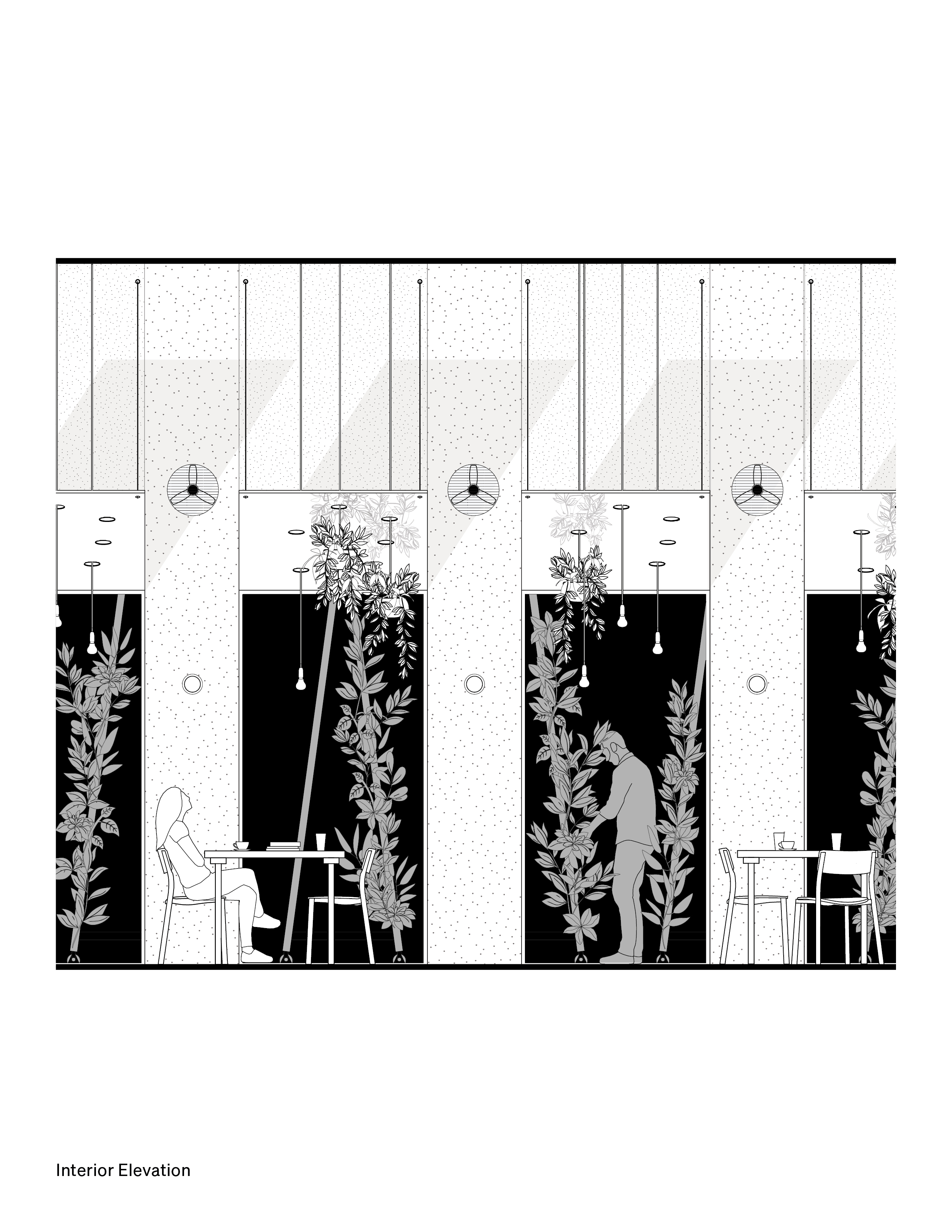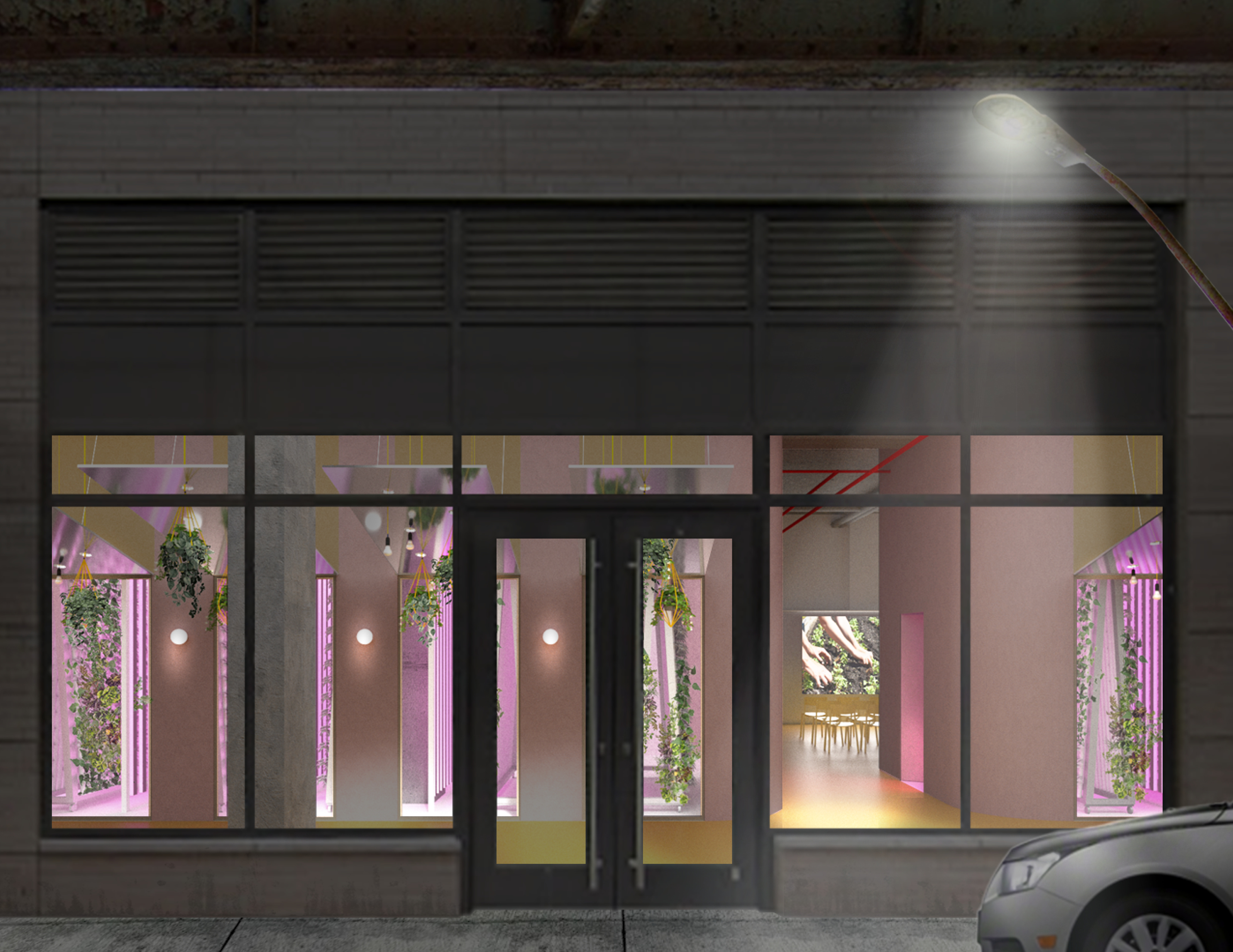From the outset, we explored a design that optimized hydroponic growing conditions while connecting to the street. The program is organized in strips: a cafe and serving area run parallel to the sidewalk and create an active and bustling storefront. The growing area is just beyond—visible from the sidewalk past the cafe tables through large windows. Finally, a flexible event space at the back provides additional seating or converts to a screening room and open area for other uses.
