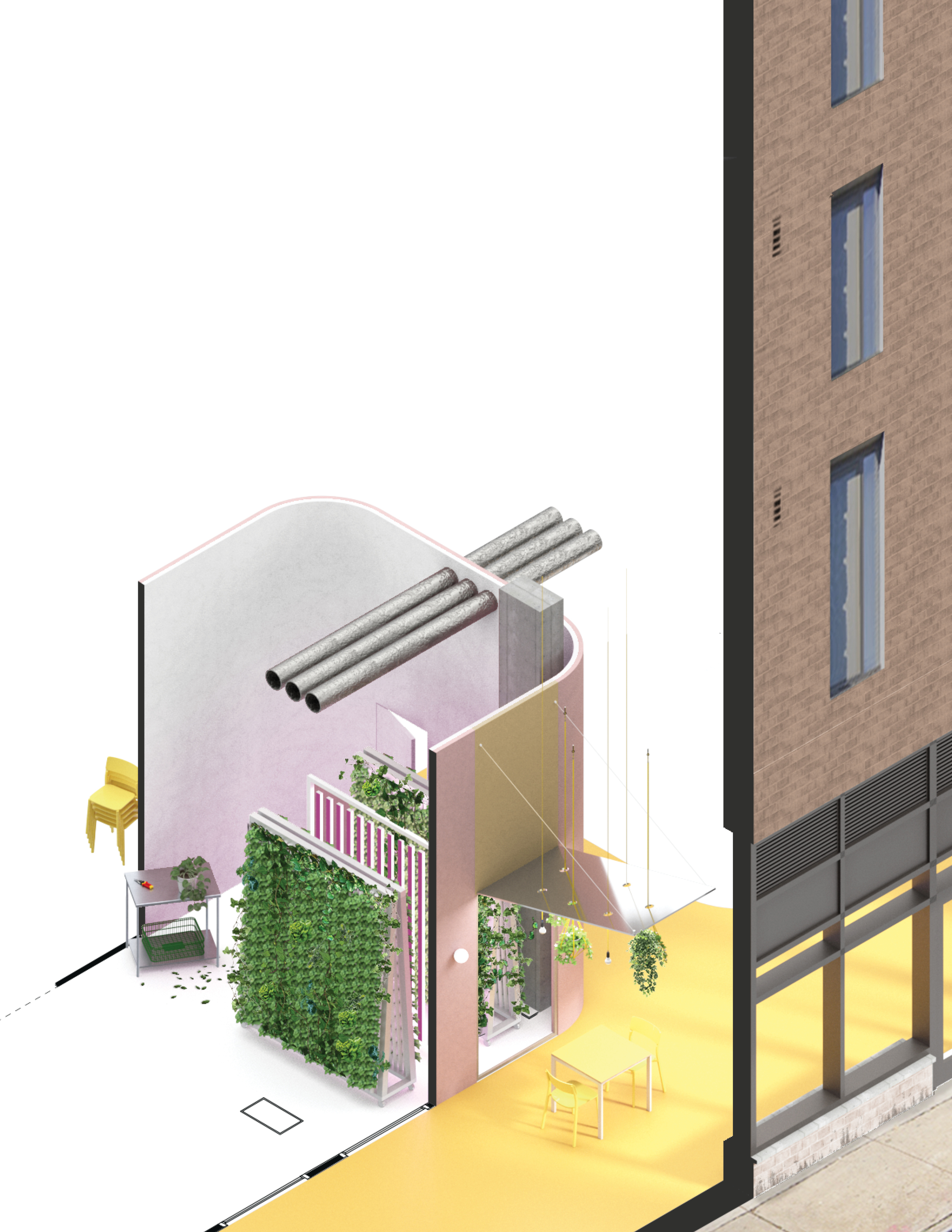 These programs create a set of nested interiors visible from the sidewalk. The design includes materials that are robust, warm, and inviting—emphasizing this as a space of vibrant activity and producing a sense of specificity and place. Mirrored surfaces, hanging plants and light fixtures, and bright colors separate the character of the interior from the larger context of the building and create a dense and bright hub that represents the project’s larger remit as a source of sustenance and community.