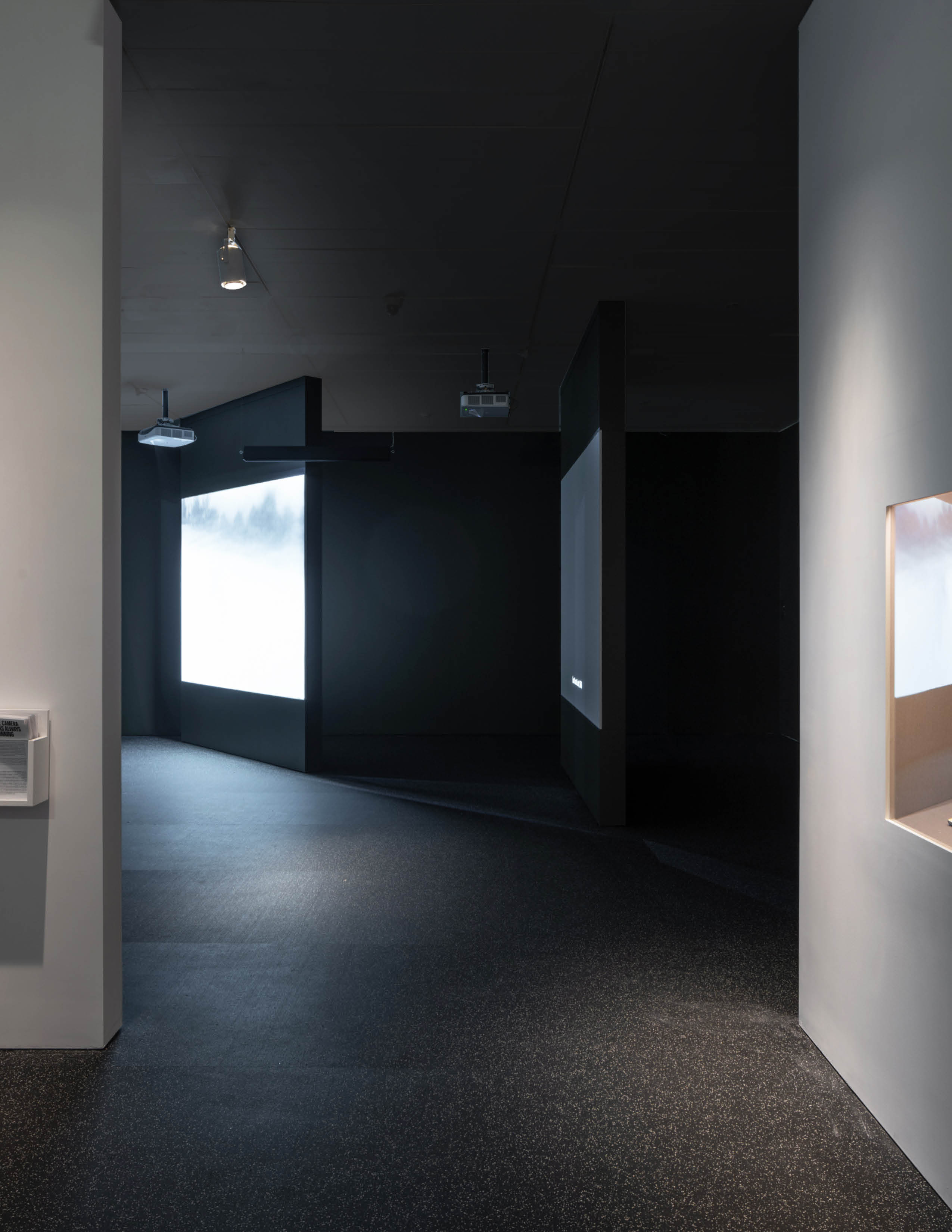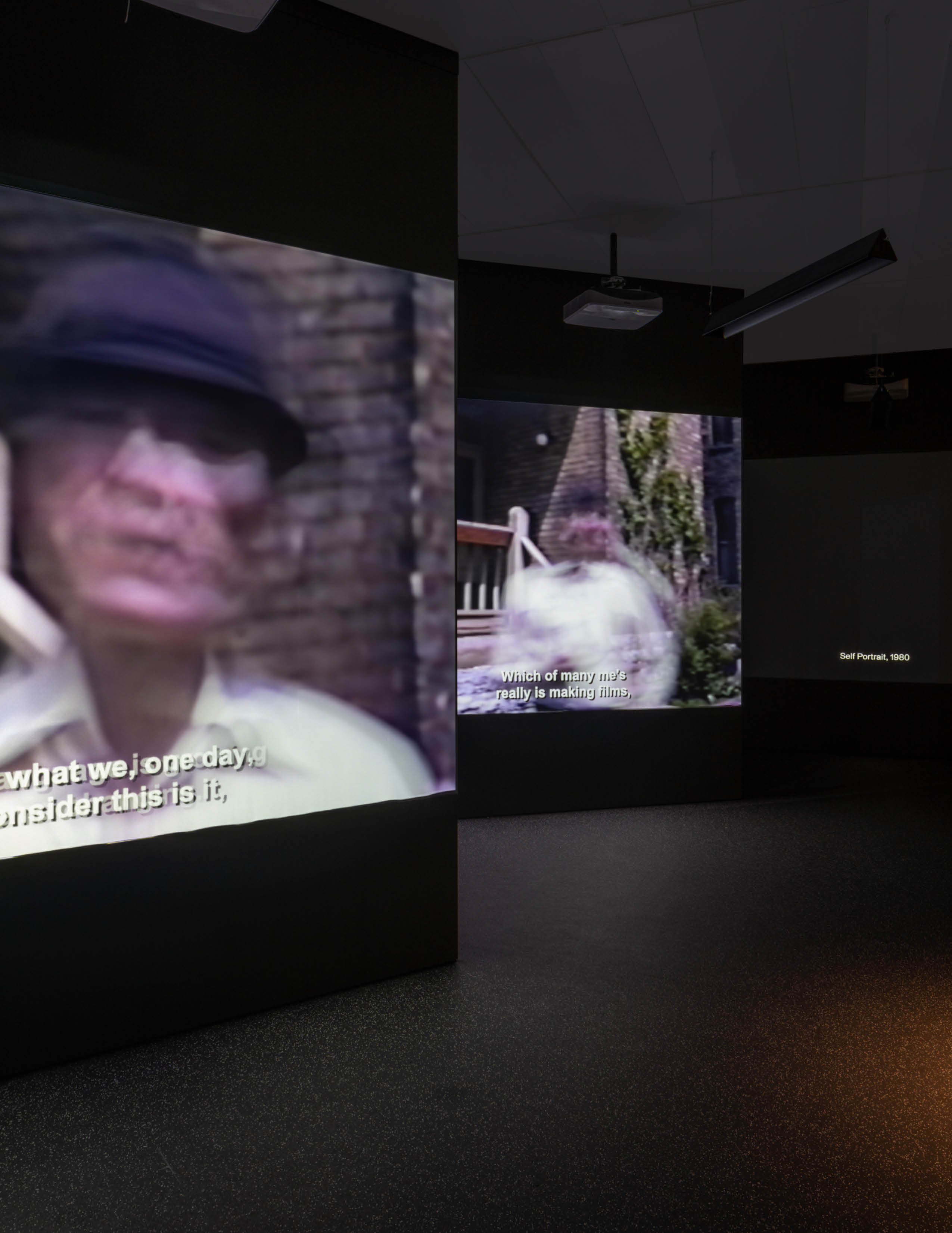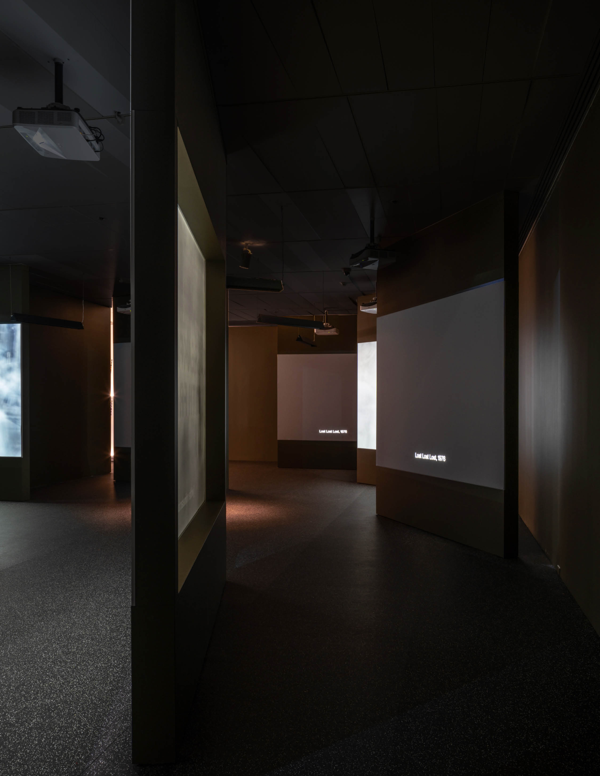 The exhibition is organized in three parts, with a more traditional ‘white box’ introduction and conclusion showing physical artifacts and material by the artist bookending a large-scale screening room. Therein, films are shown over a field of twelve screens that visitors can move freely through as a peripatetic experience, and by doing so, re-editing the films into infinite new sequences.