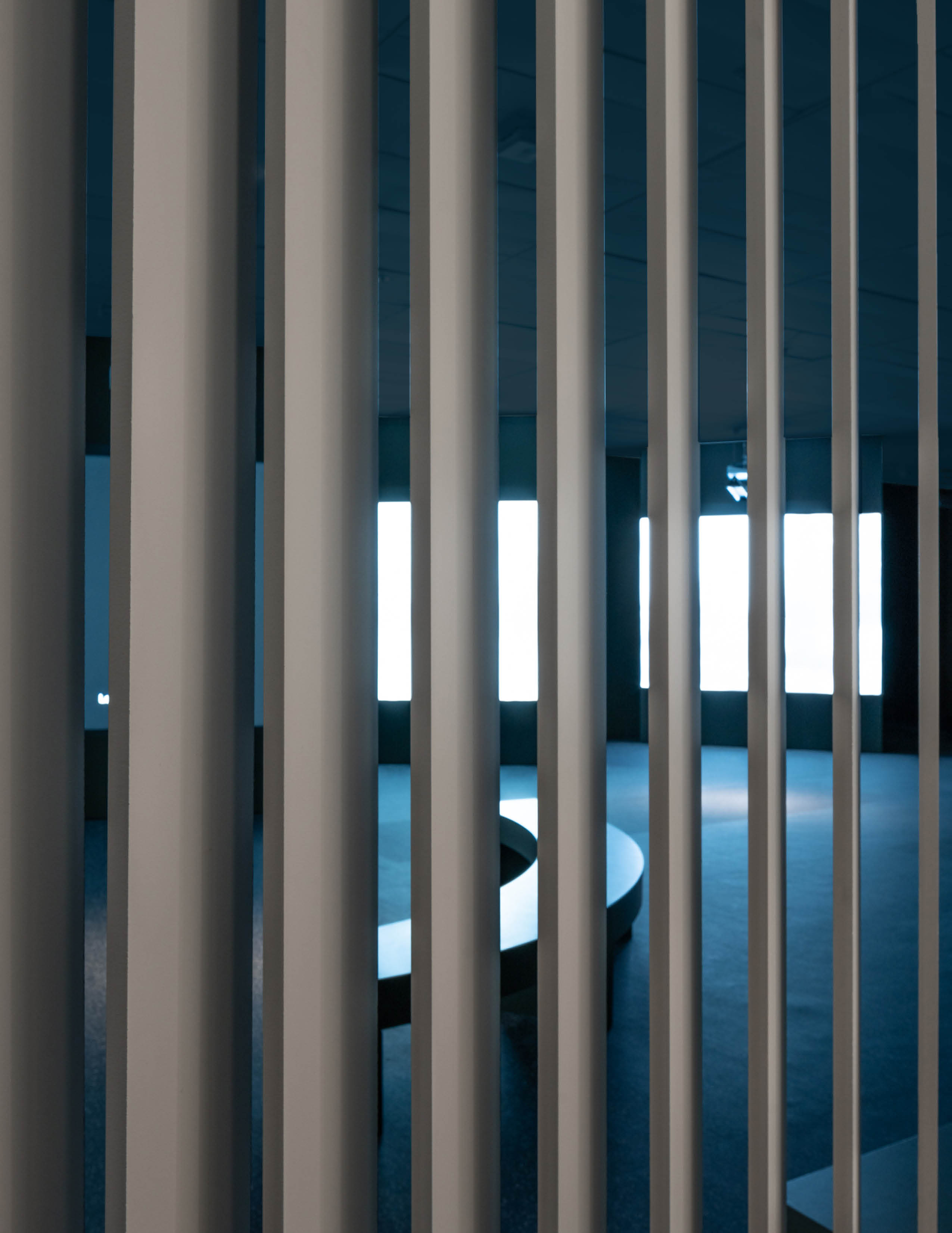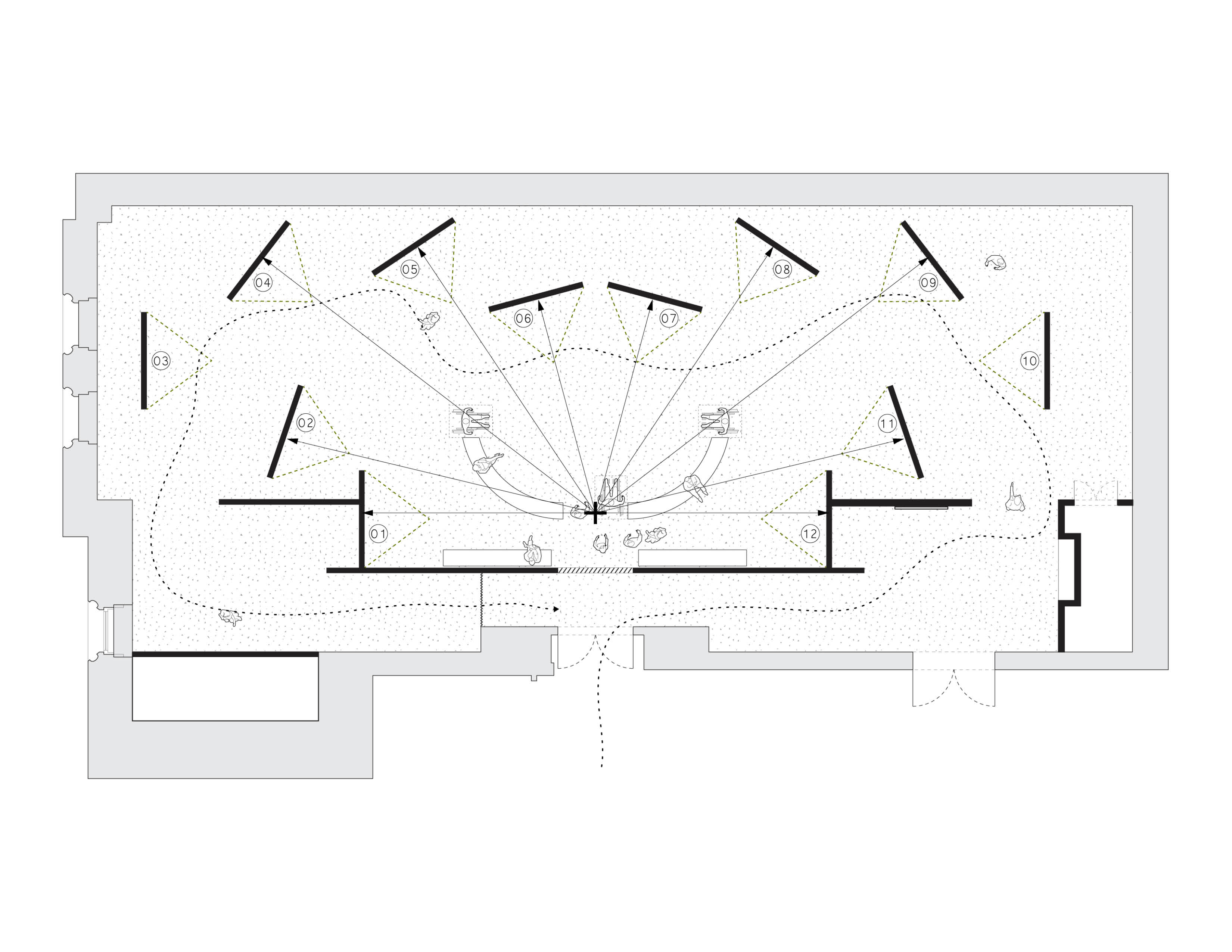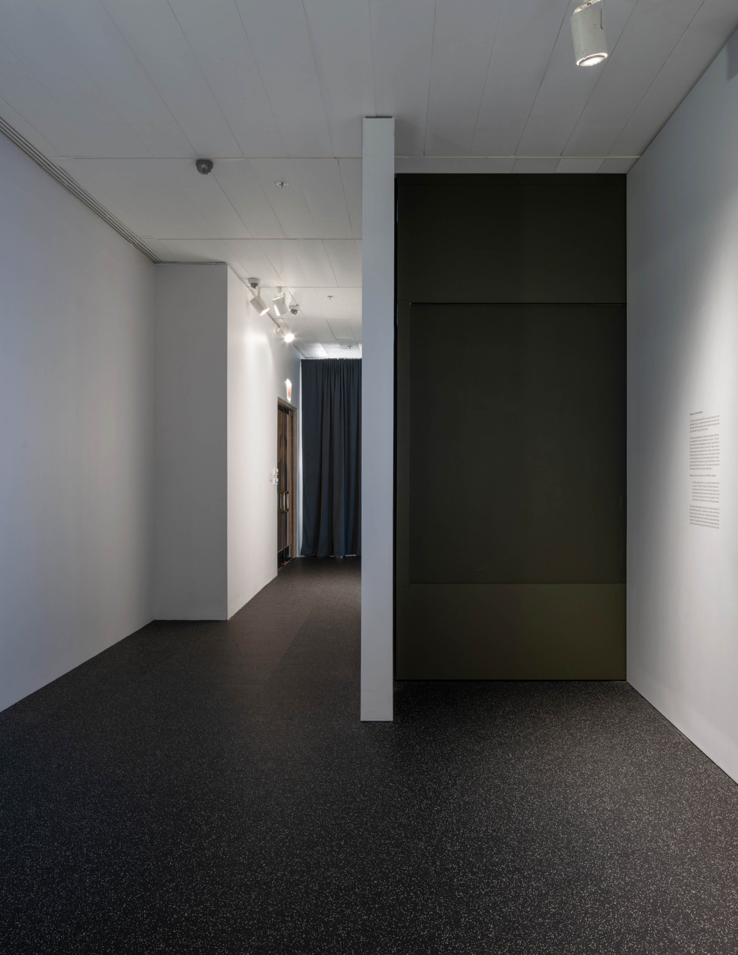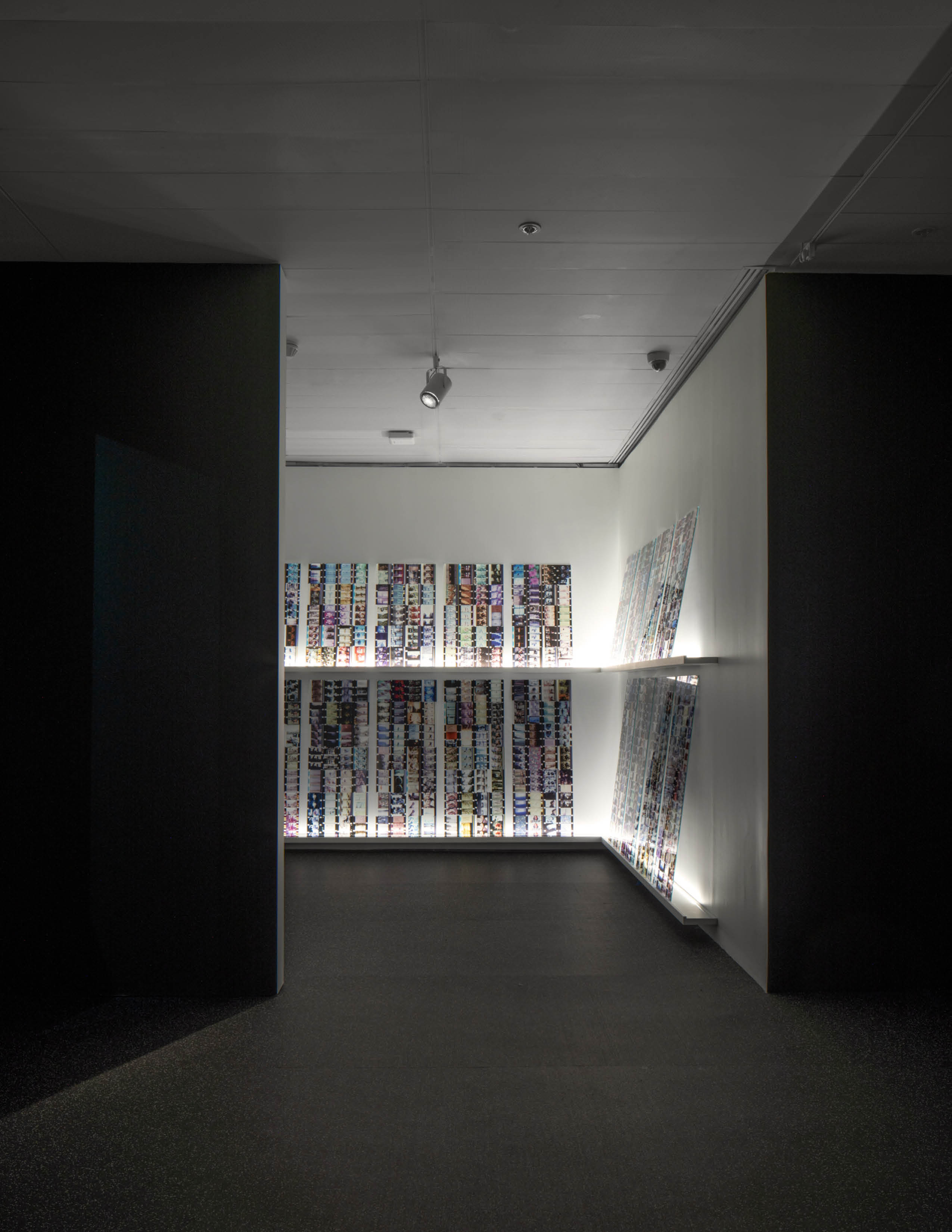 The exhibition is organized in three parts, with a more traditional ‘white box’ introduction and conclusion showing physical artifacts and material by the artist bookending a large-scale screening room. Therein, films are shown over a field of twelve screens that visitors can move freely through as a peripatetic experience, and by doing so, re-editing the films into infinite new sequences.