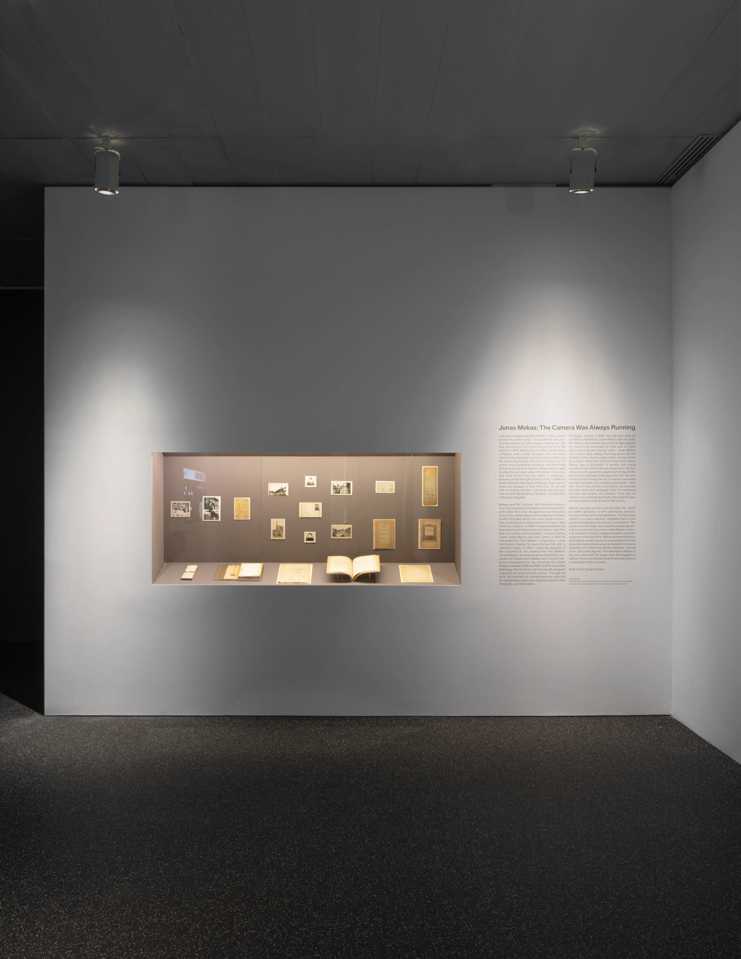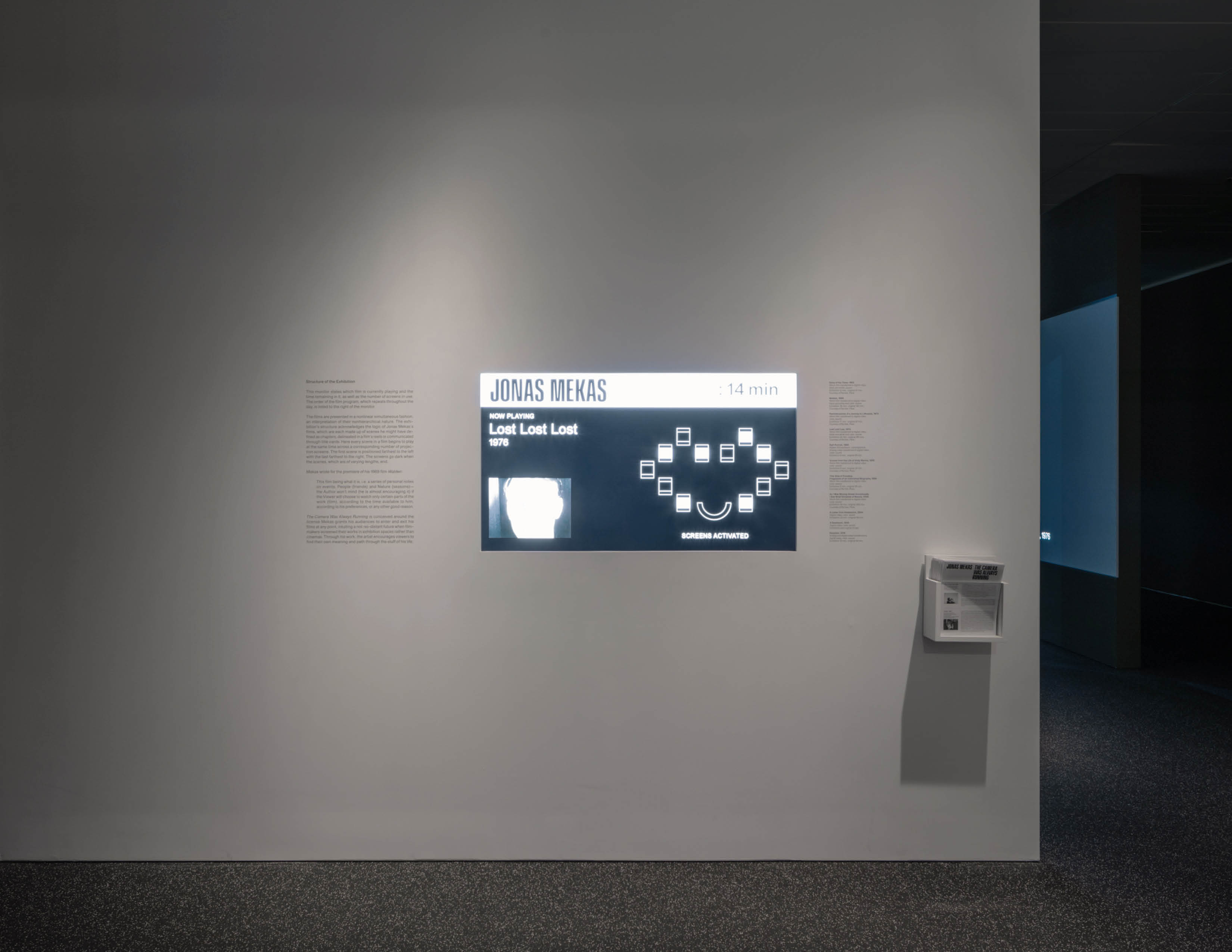 The films themselves, eleven in total, are screened in chronological order, divided into chapters and projected onto the large-scale, free-floating projection walls. Subdivided chapters play at the same time with sound controlled by directional speakers that produce moments of clarity in the larger field of overlapping soundtracks. Visitors are encouraged to enter the ‘orbit’ of each screen, moving between collective and intimate viewing. The screens themselves all face the center of the screening room, where visitors can watch all twelve projections at once—creating a dense field of visual information. The layout corresponds to Mekas’s observational approach to filmmaking, in which the world around was allowed to simply happen, or unfold, with the filmmaker as a peripheral observer.