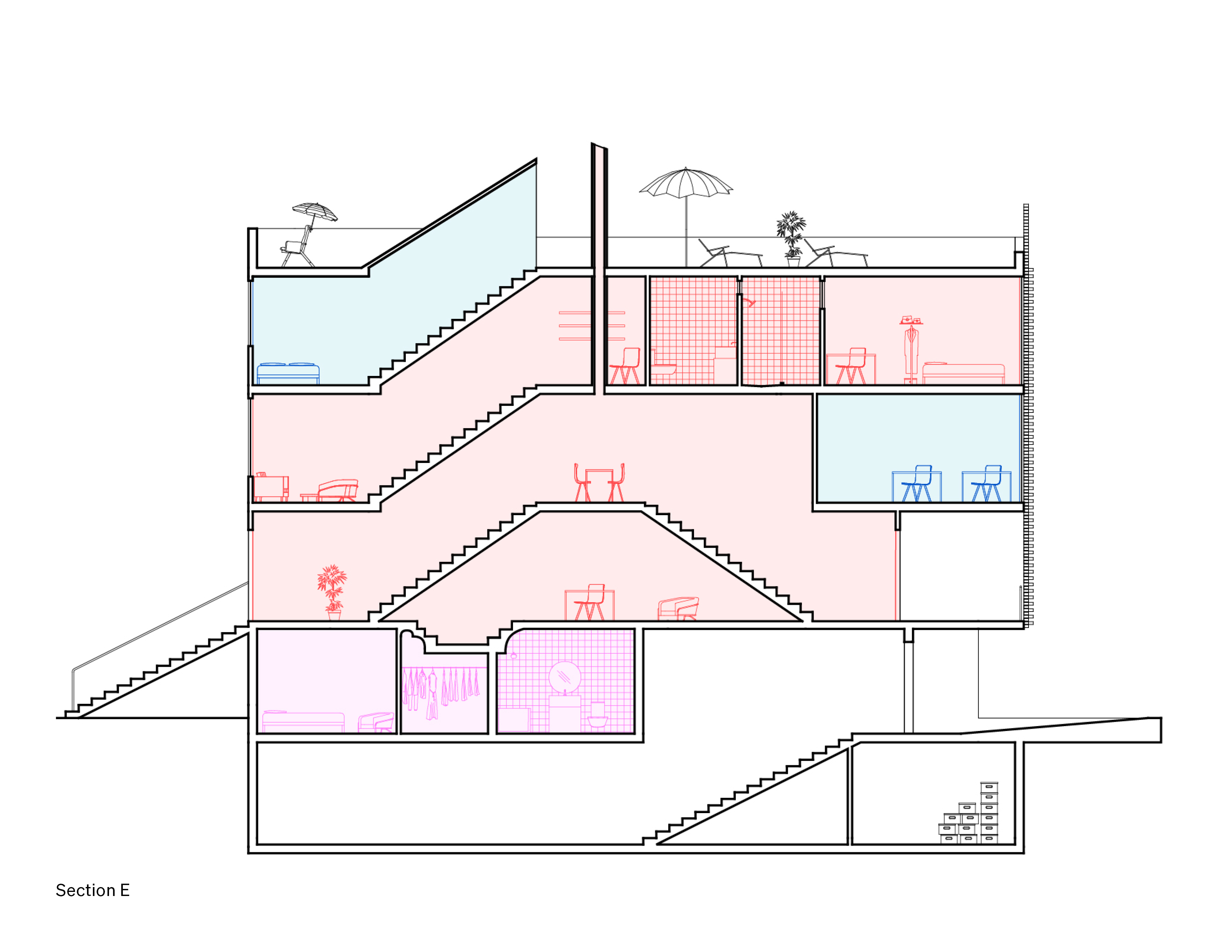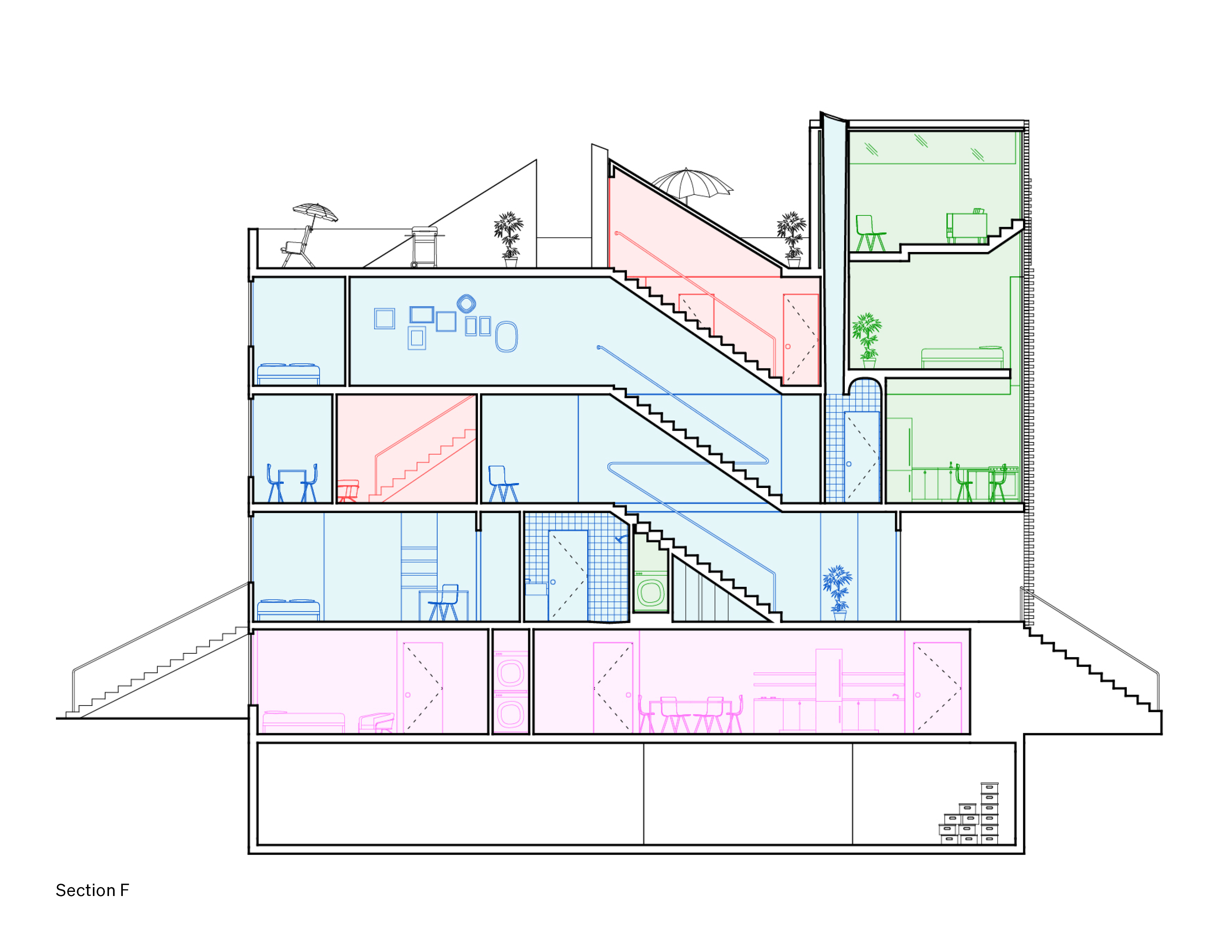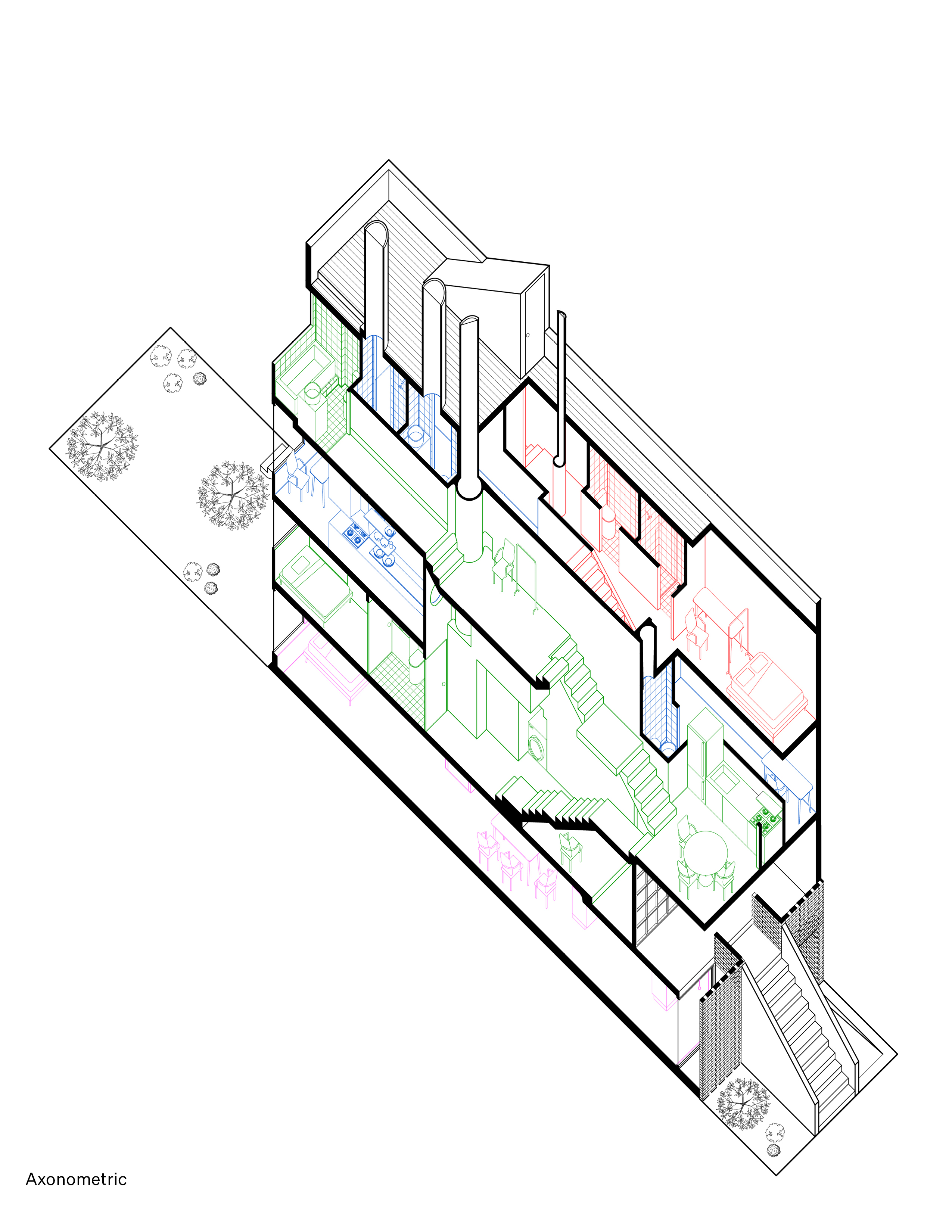 We begin with the idea that how space is perceived might count more than a game of numbers—that space quality might mean something different than space quantity, and that quality might be as much about volume as it is area. In a city that is growing ever-denser, with space at a premium, what models of urban living are disappearing? The townhouse, once a staple of neighborhoods around New York, has become an option for only a select few, with the majority of that stock subdivided and rented floor-by-floor. The townhouse offers inimitable spaces produced by a multi-level organization that feels as private and intimate as open and dynamic. Here, we investigate that fluid section over an ultra-narrow plan.