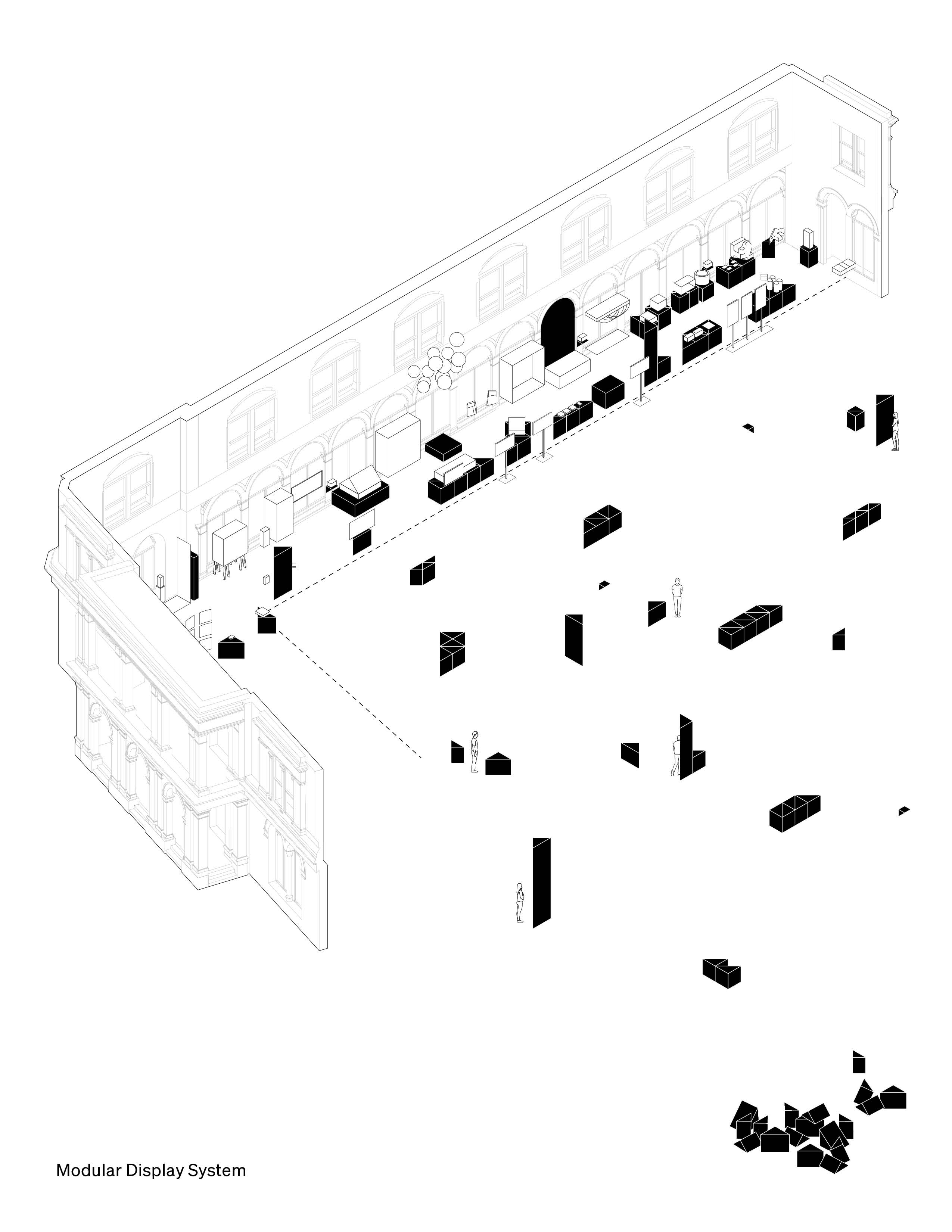 To bring together the broad range of work we created a series of modular triangulated plinths that could be grouped together to form larger surfaces or staged individually as floating pixels in the gallery. They vary in height, creating a diverse landscape of stuff attaching itself to and dislodging from the sides of the corridor to produce eddies and flows in the path adjacent to the sidewalk. The exhibition models different ways of moving, looking, and engaging the works through simple spatial building blocks.