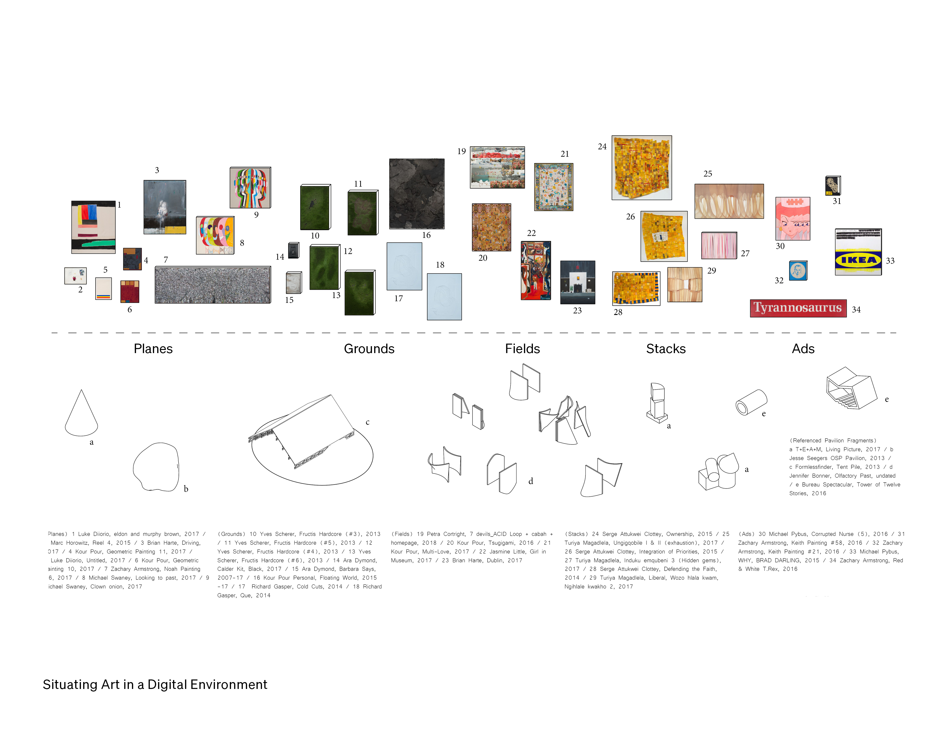 For the project, we looked at how the digitization of information and environment have transformed space—including new interpretations of scale (everything is both large and small), proximity (the collapse of near and far), and time. Navigating digital information asks us to construct narratives through juxtapositions which we try and reproduce here through texture mapping and pairing known pavilions with works of art. If André Malreaux’s ‘museum without walls’ first moved the museum to the book, now we have a chance to maintain the latter’s democratic ethos while re-spatializing it within the digital medium (with walls!). Our museum describes itself through different digital media, from google maps to instagram, and operates as an encounter and a destination; an imagined site and a real virtual space.