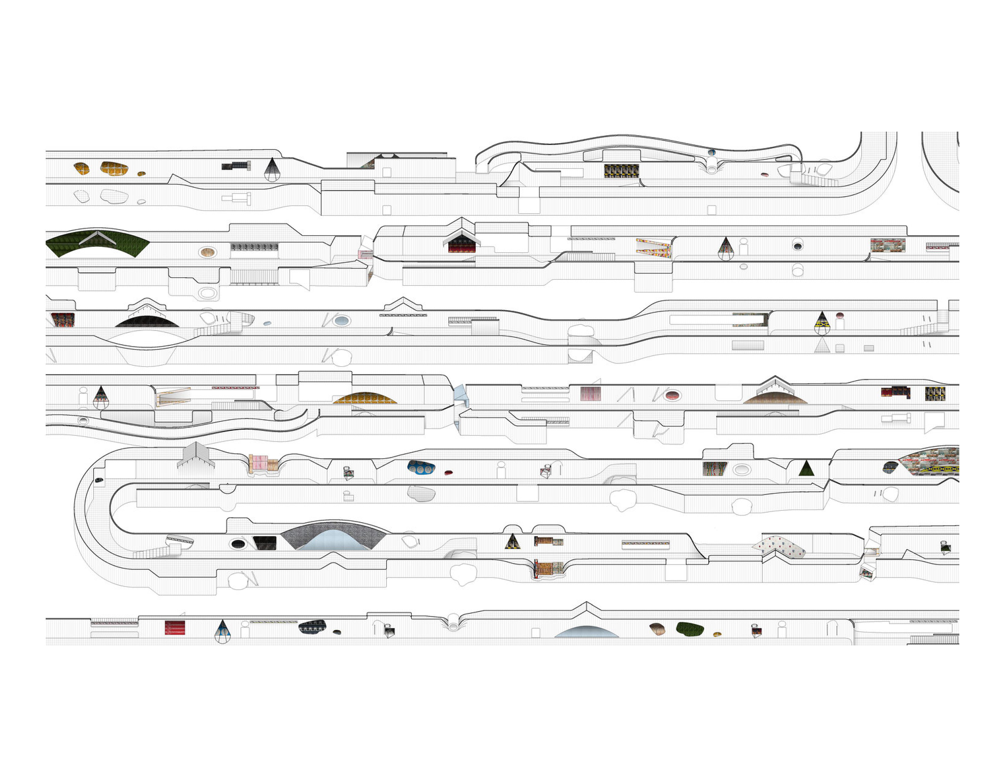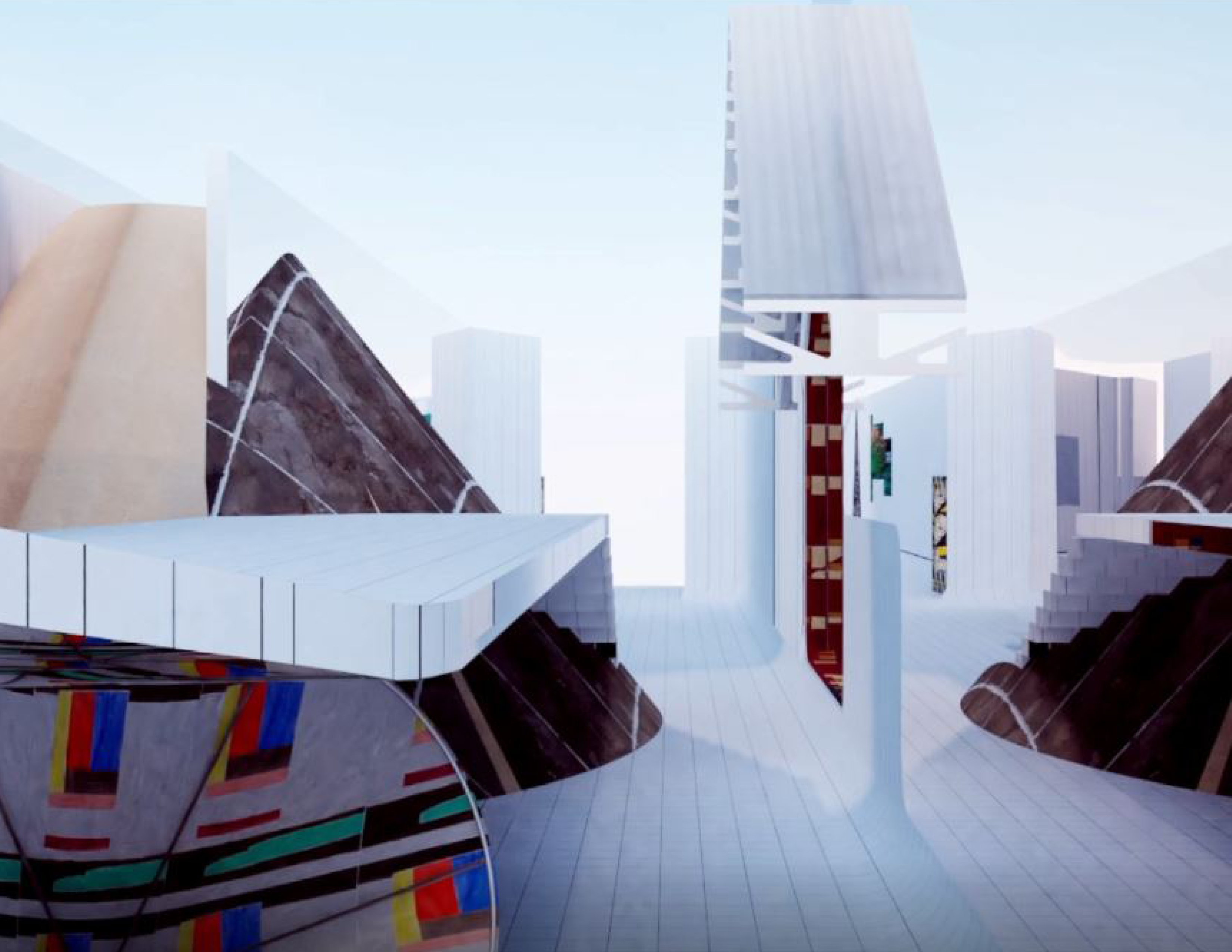 The Museum of Walls Without Walls is a competition entry for an imagined digital exhibition space where we float fragments of other architectural designs (by peers and colleagues) in an endless corridor as display surfaces. The project looks at how images and forms circulate in contemporary practice, how they have limited lifespans, and how we might deploy a collective creative energy to extend their use.