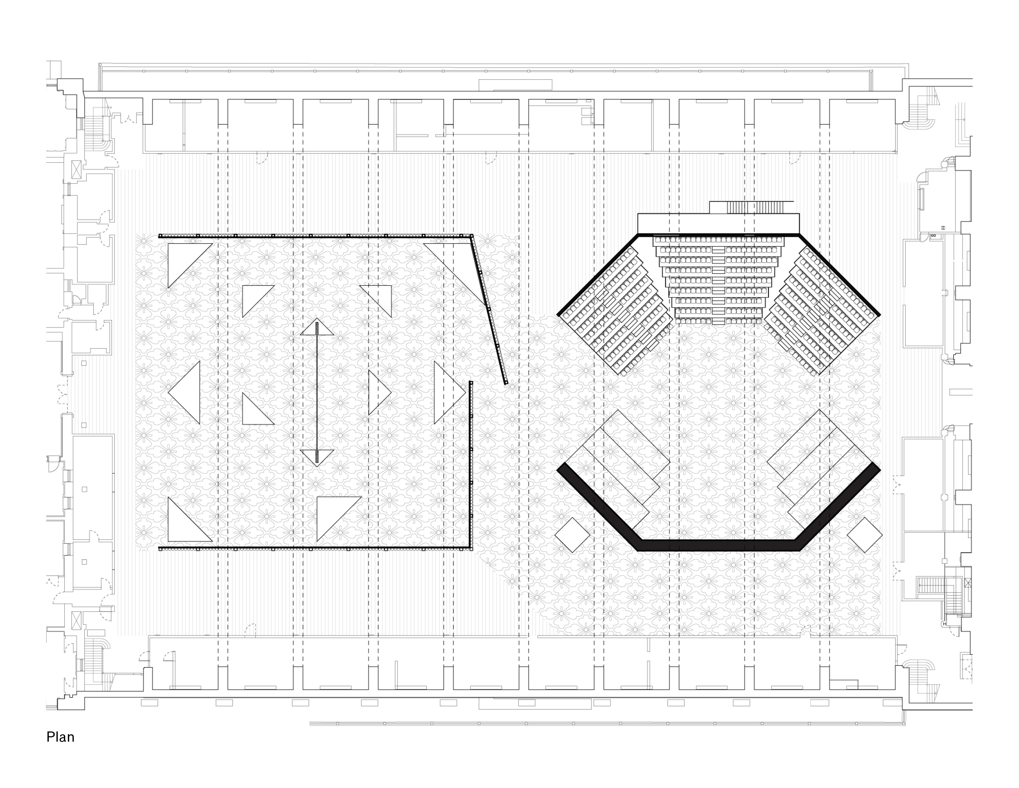 The Park Avenue Armory’s Drill Hall represents an overwhelming, if not monumentally beautiful space. The design organizes the large gallery and auditorium through layered sightlines—primary, secondary, and tertiary—shaped by dynamic performances. All surfaces are overlaid with a custom vinyl print and dense series of projections, making the inert architecture come to life as a complicit actor in a system of viewing, and asserting a new, if ephemeral, presence in the historic structure.