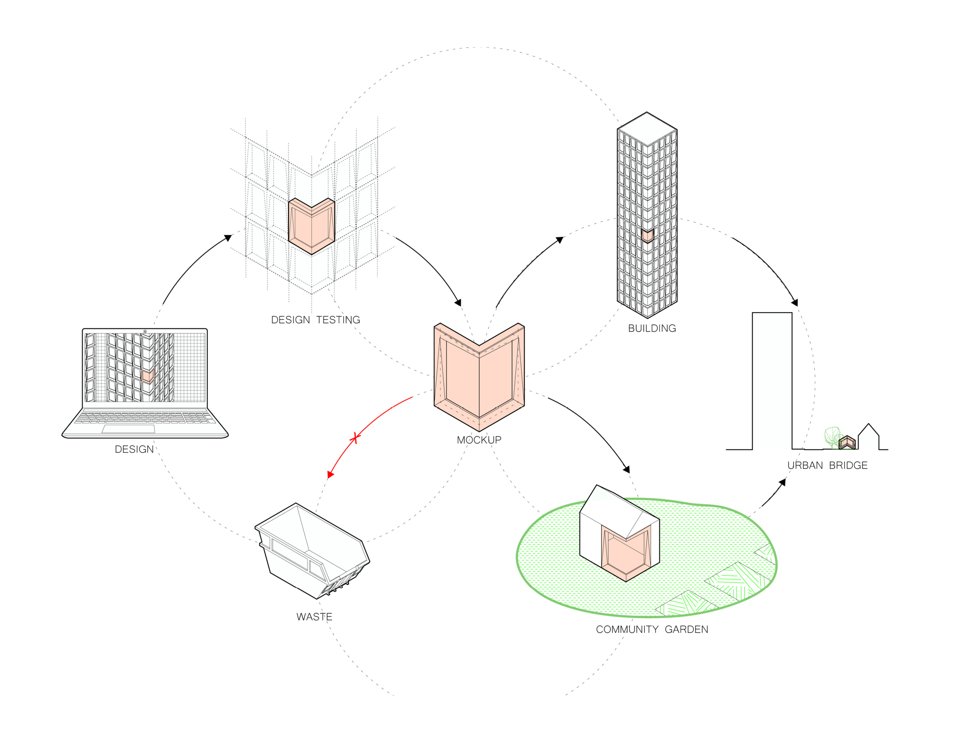 The scale of many mockups aligns with various structures built in community gardens across the city—casitas, sheds, greenhouses, shade structures—which provide possible sites in which to re-situate the fragments. Bringing the image of the growing city down to the ground allows the mockups to serve as double agents: humanizing the scale of the skyline and getting built into new forms produced through conversations around program and use. Ultimately they become new ambassadors that mine unexplored potentials of development.