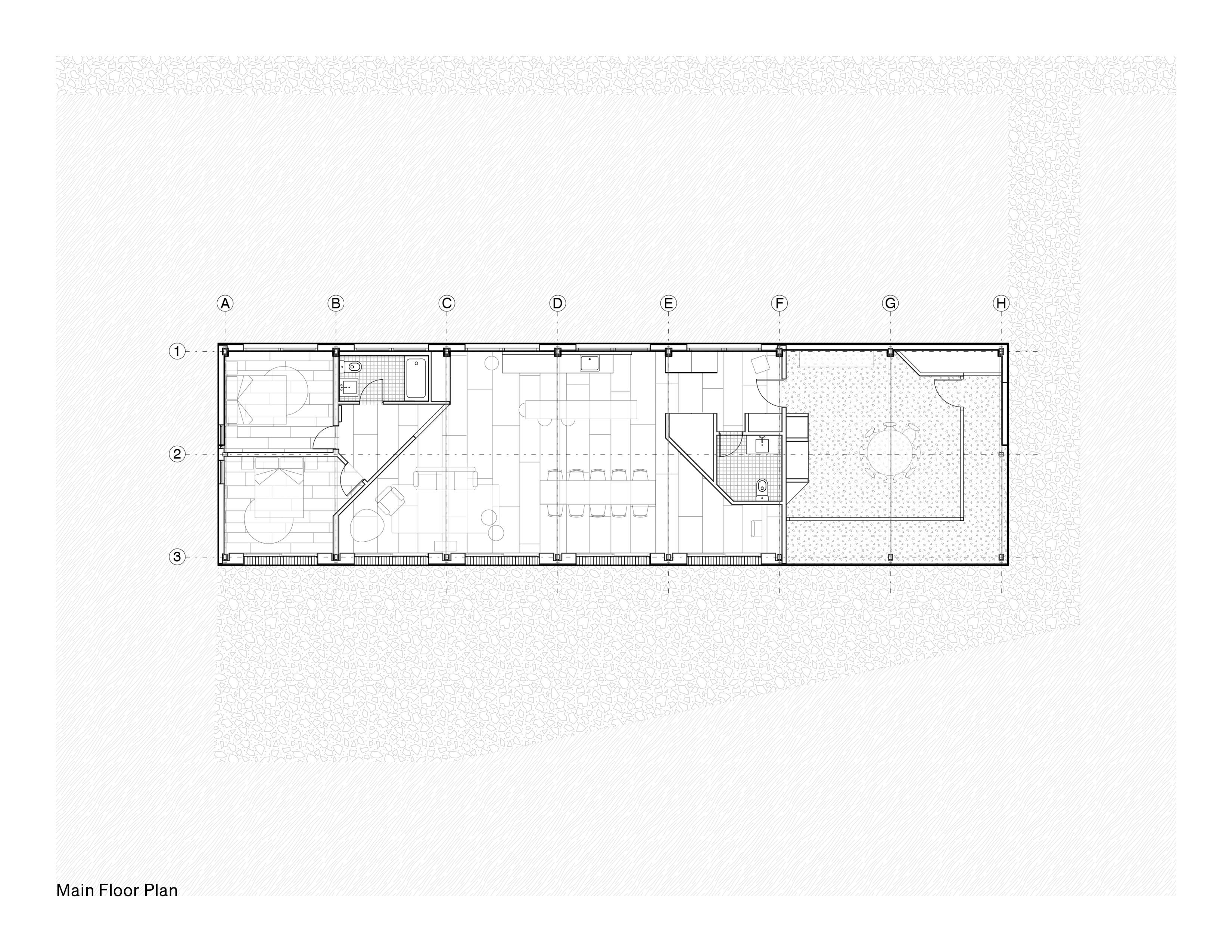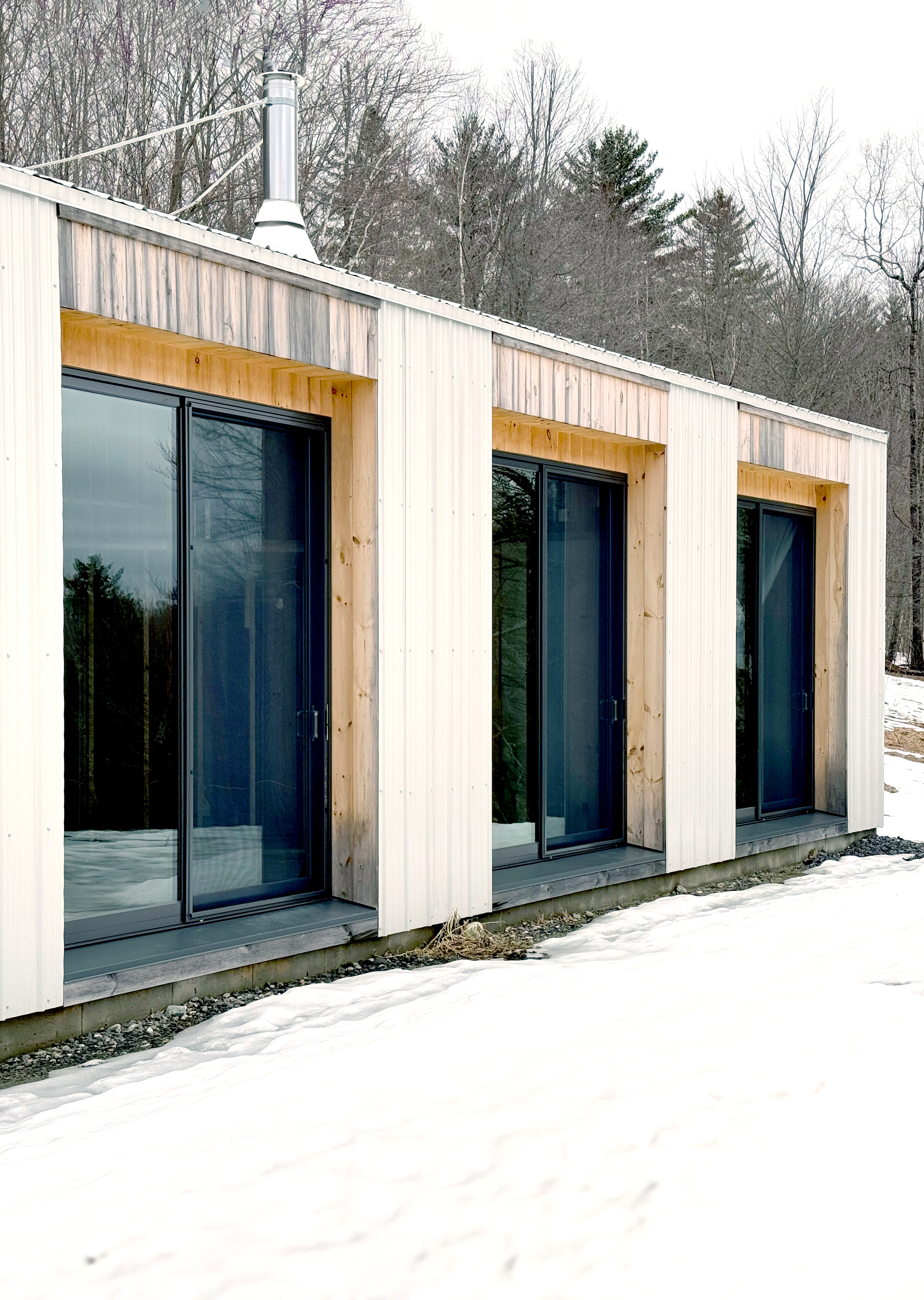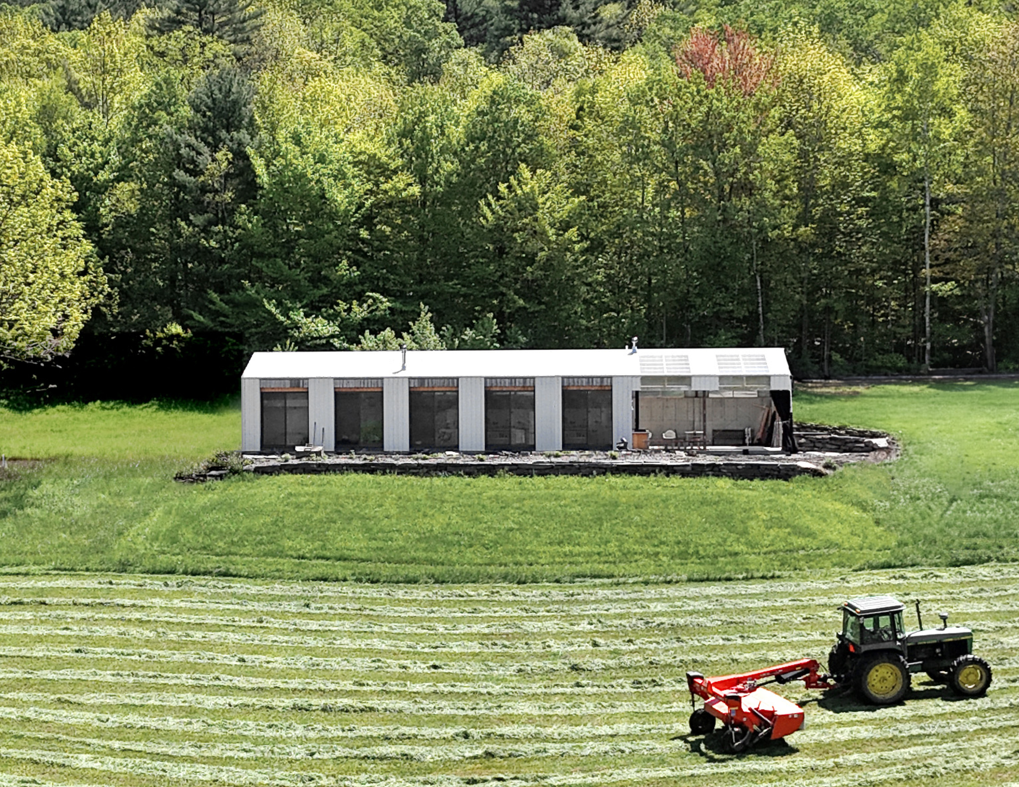 A house built into a hillside, oriented westward with views to the Green Mountains. The structure began as a research project looking into hybridizing industrial structural systems with a more traditional approach to wood-frame house building.