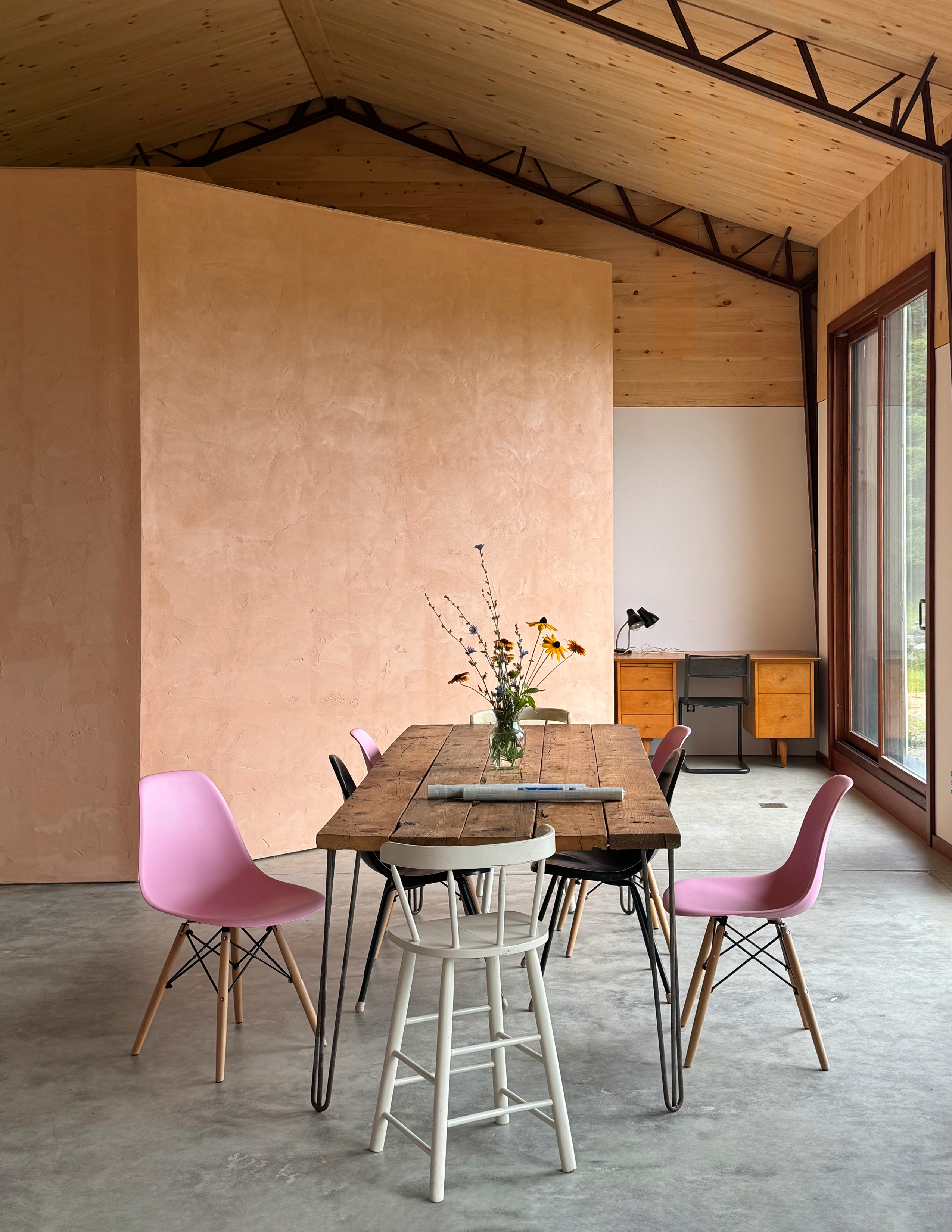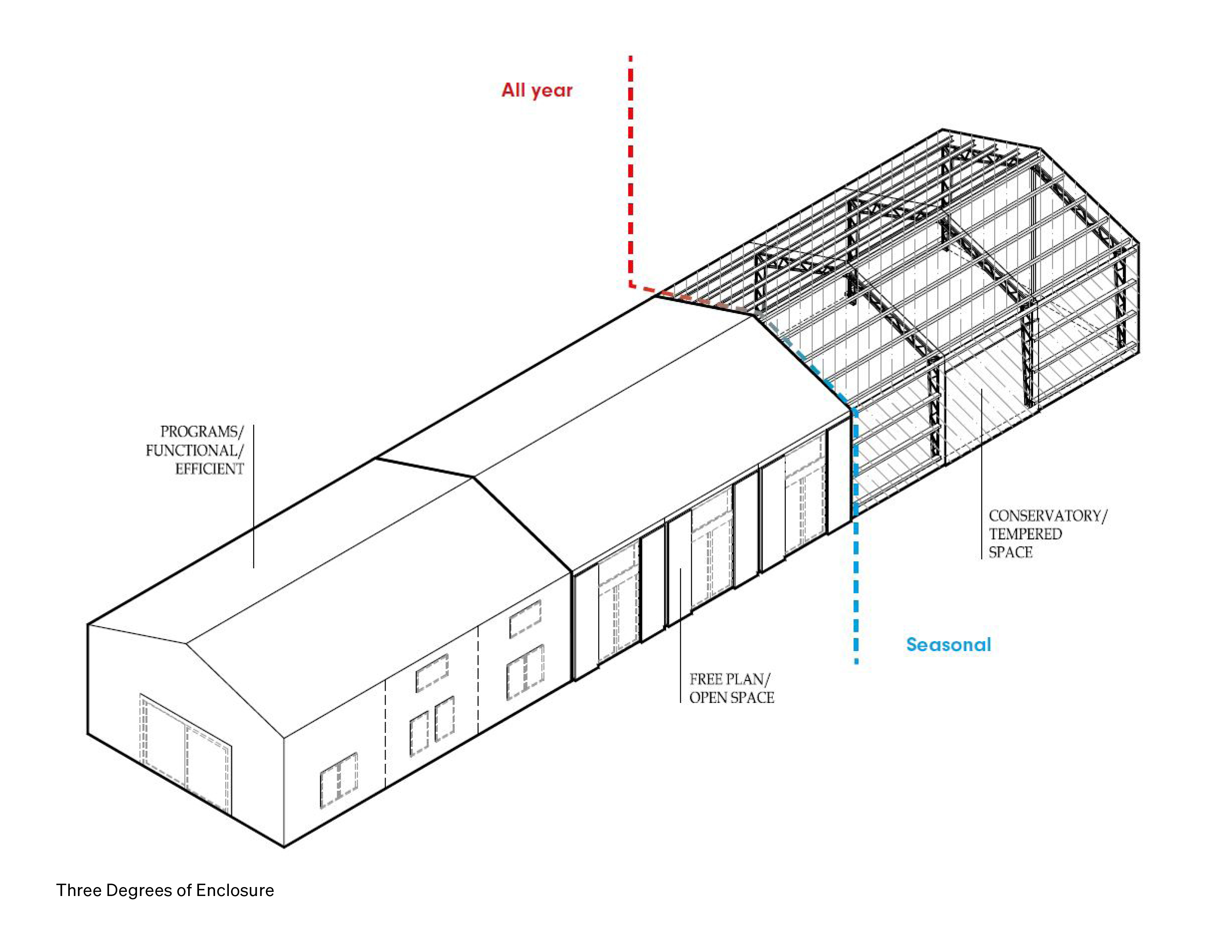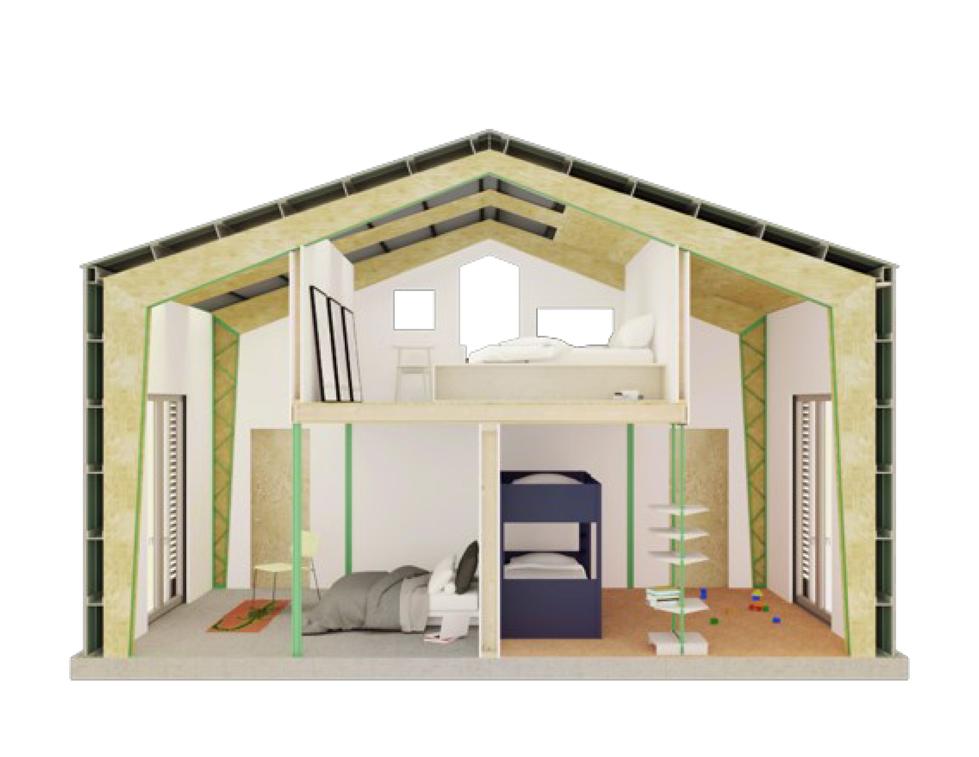 By combining several different pre-fabricated and off-the-shelf systems, the architecture was conceived to be fast, cheap, and surprising. The structure itself includes different levels of insulation and privacy, from tightly packed insulated bedrooms to a large open living area to a semi-outdoor space.