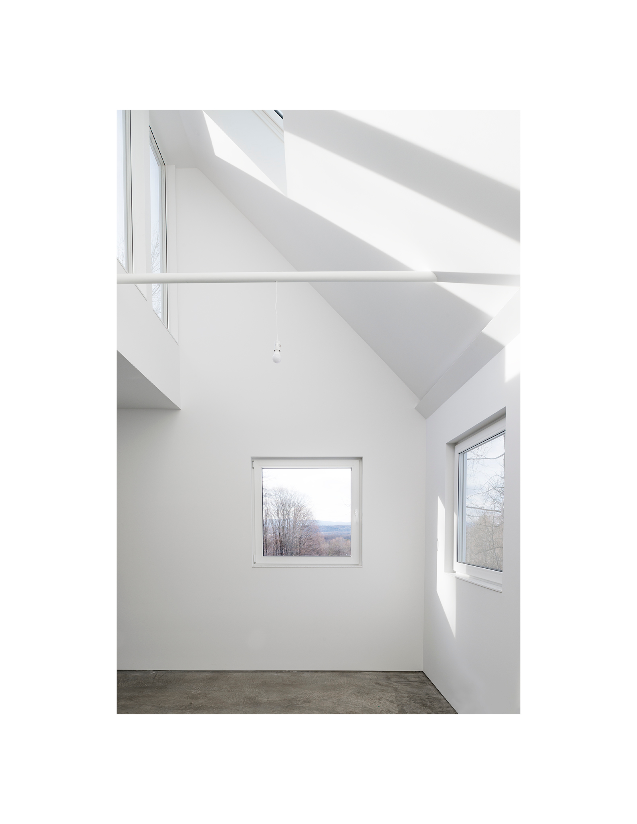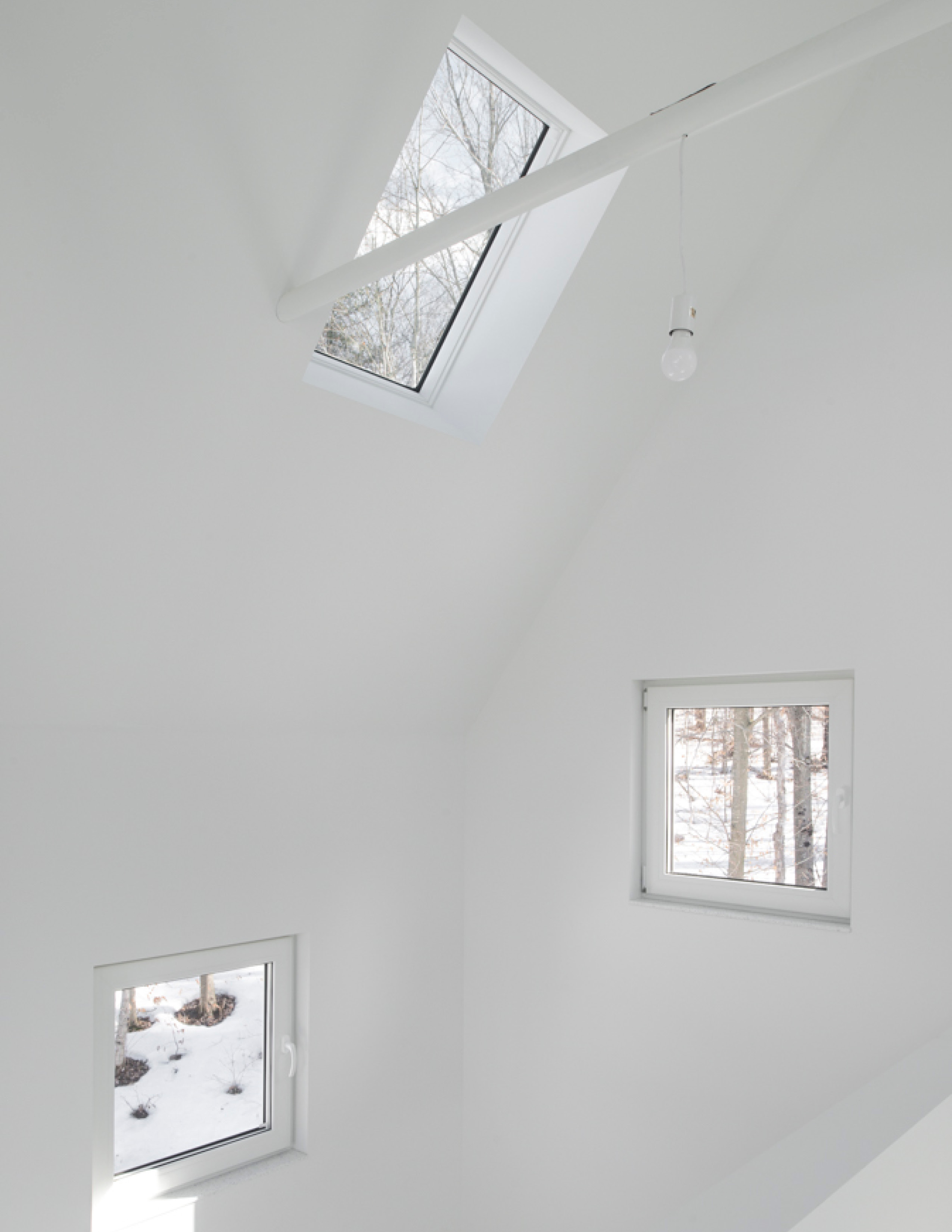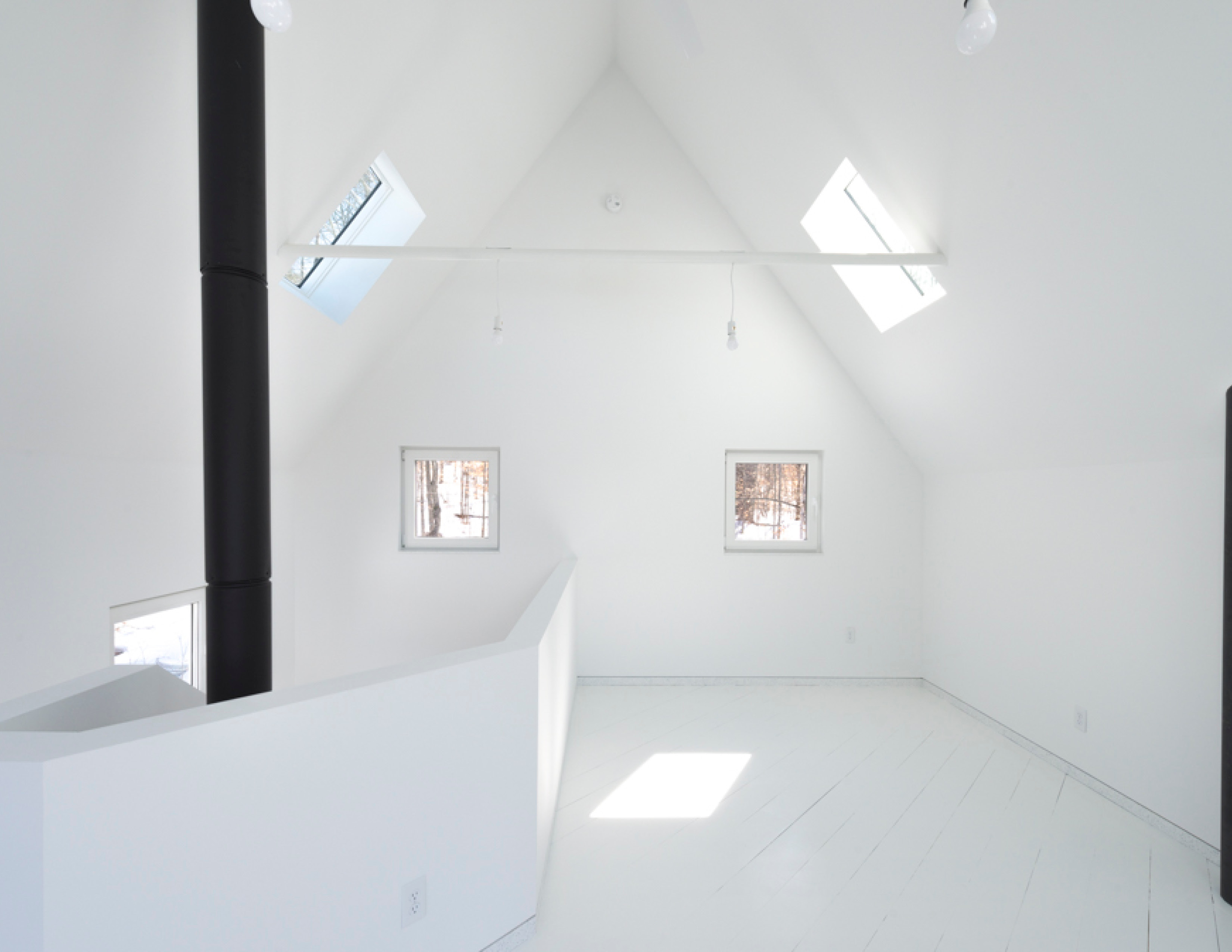 The structure was designed and built in eight months, a quick project as an informal getaway. For the design, we looked to Vermont’s aggregate structures where barns, houses, and sheds all grow on and around each other, clustering, it almost seems, for warmth. Here, the studio is set off-angle from a two-story living area, maximizing orientations facing the surrounding landscape. In keeping with the efficient insulation strategy and in lieu of large window-walls, smaller square windows throughout frame moments of the landscape through considered picturesque tableaux. Custom details, deliberate asymmetries, and material contrasts appear throughout the design and introduce unexpected moments to a familiar language.