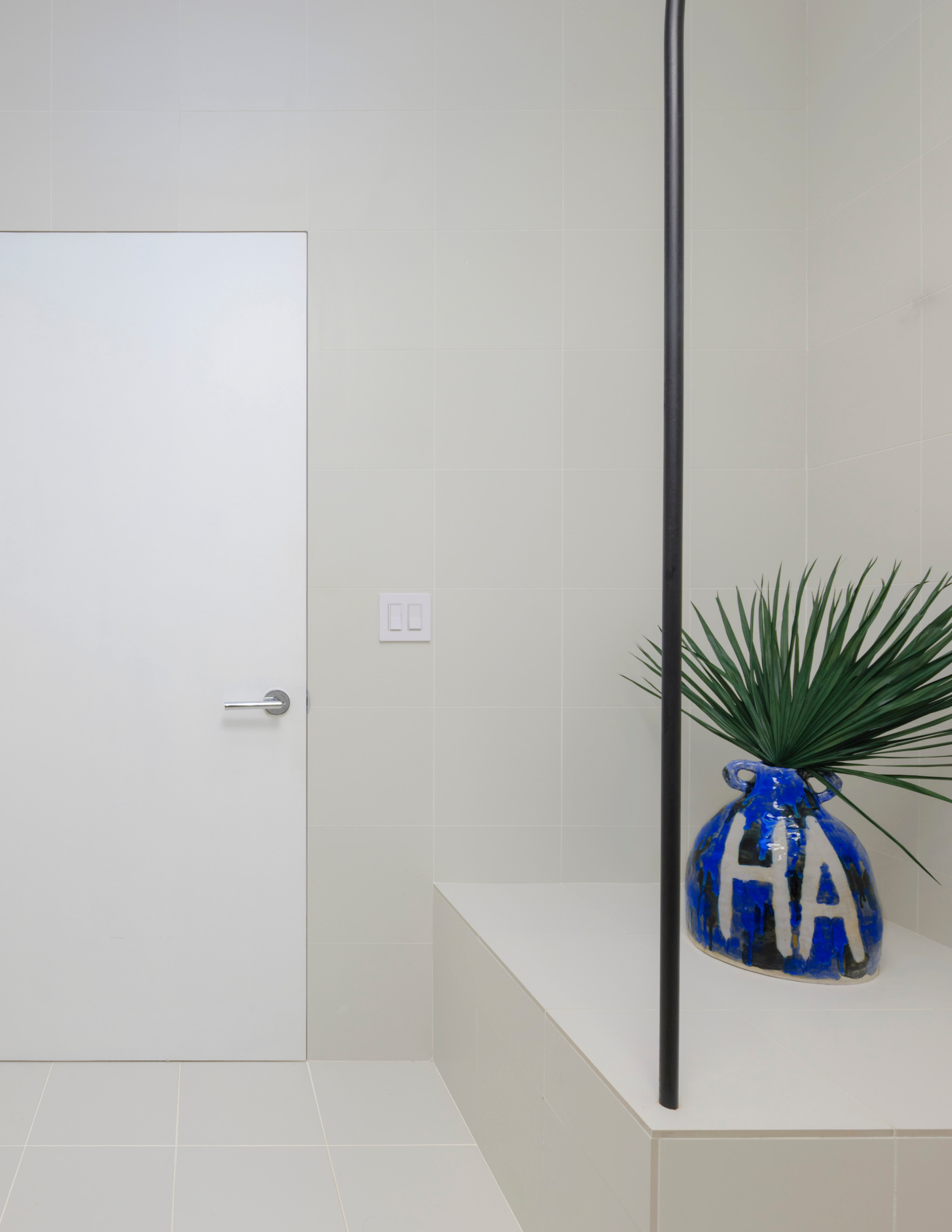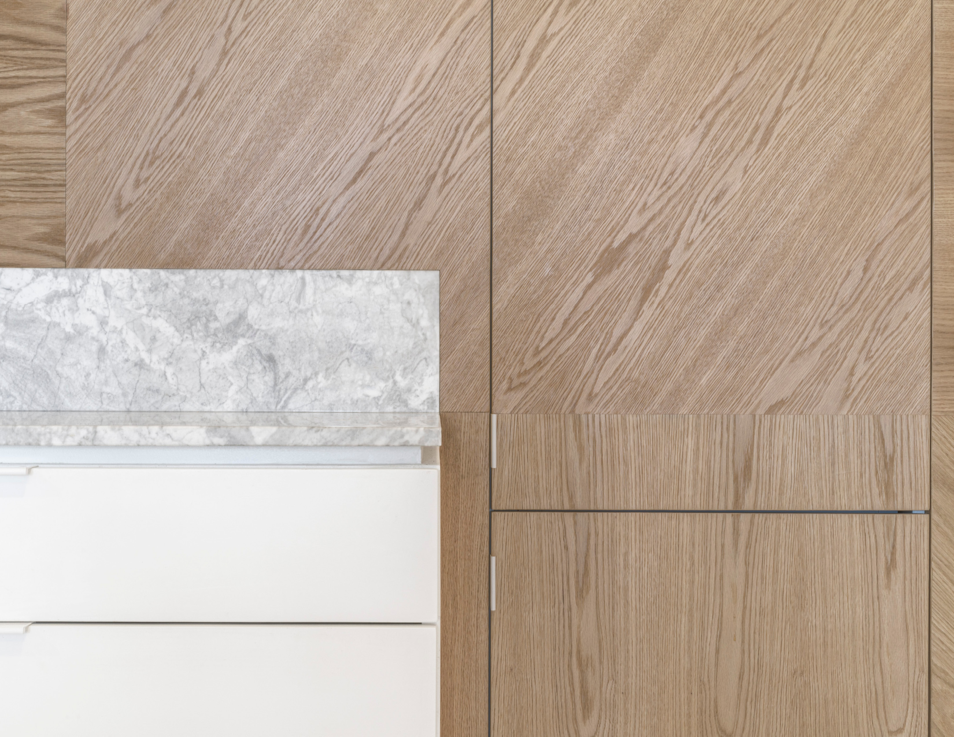 The main design feature delineates a new kitchen and dressing area introduced through a large volume containing closets, storage, and appliances. This new millwork structure is clad in veneered panels intentionally offset, mis-oriented, and stitched together, and anchors the design through a single gesture that both directs and intentionally blocks views. Throughout, refinished floors and a new ceiling with patterned conduit draw attention away from the building’s infrastructure and focus the eye to the existing and new material palette.